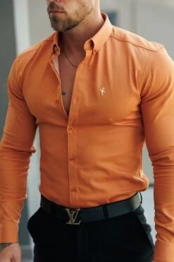 FS Super Slim Stretch Taupe Denim Long Sleeve With Button Down Collar Gold Metal Decal – FS1130