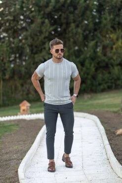 Father Sons Classic Short Sleeve Light Grey Knitted Wide Rib Crew With Gold Emblem – FSH560