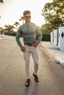 Father Sons Super Slim Stretch Classic Oxford Light Blue Short Sleeve With Grandad Collar – FS937