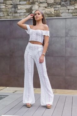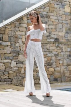 The ultimate poolside co-ord head turner this season goes to the ‘AYLA’ co-ord. Made from a soft crochet knit which compliments the female form perfectly. It is the perfect pool party or evening attire. It airs a bohemian twist yet ooches elegance at the same time. The crop can be worn as a co-ord with the Ayla high waisted trouser or can be worn solo paired with platzo trousers or shorts.