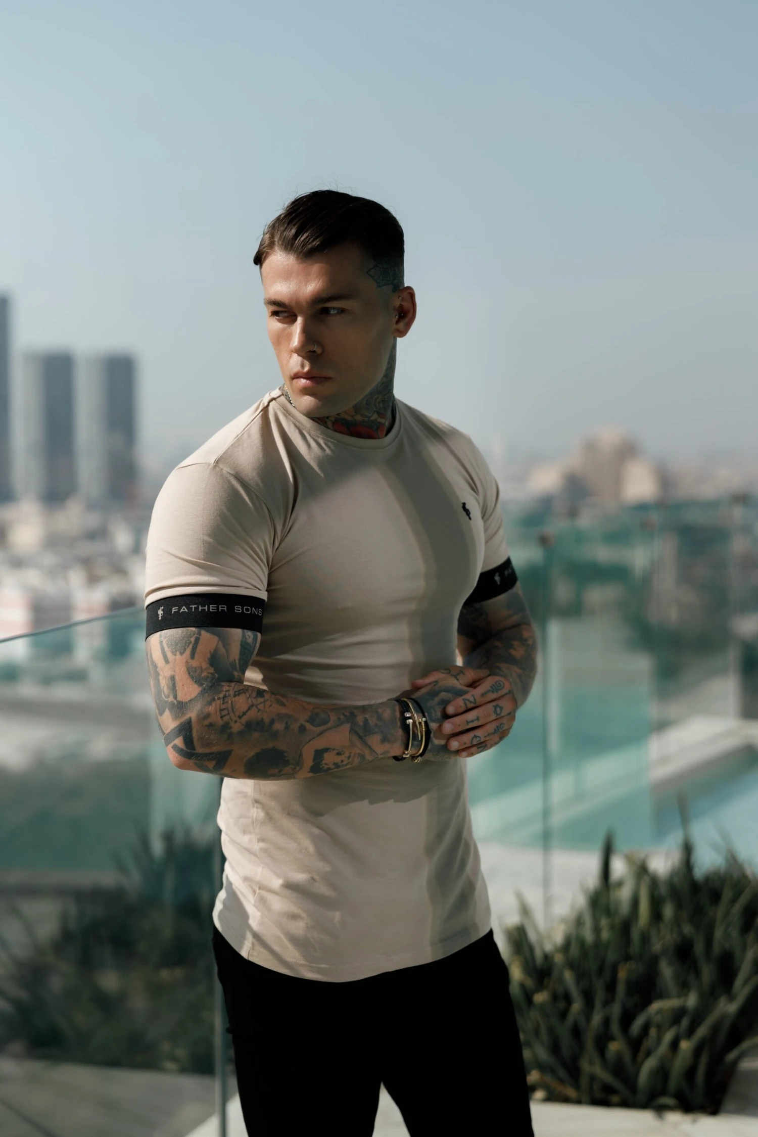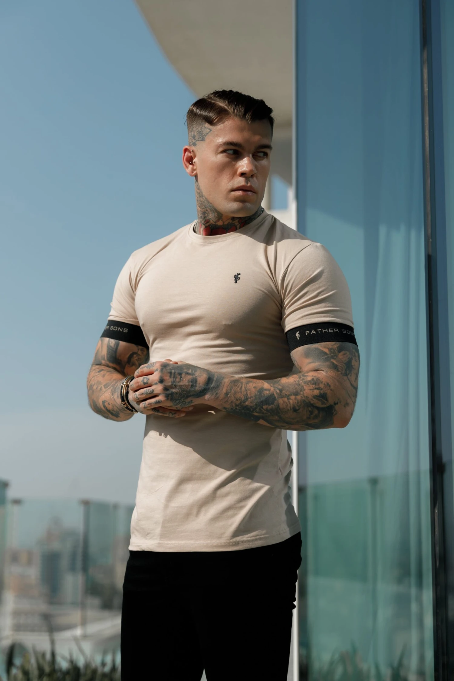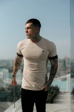 Father Sons Classic Beige Crew T Shirt with FS Sleeve Branding – FSH782