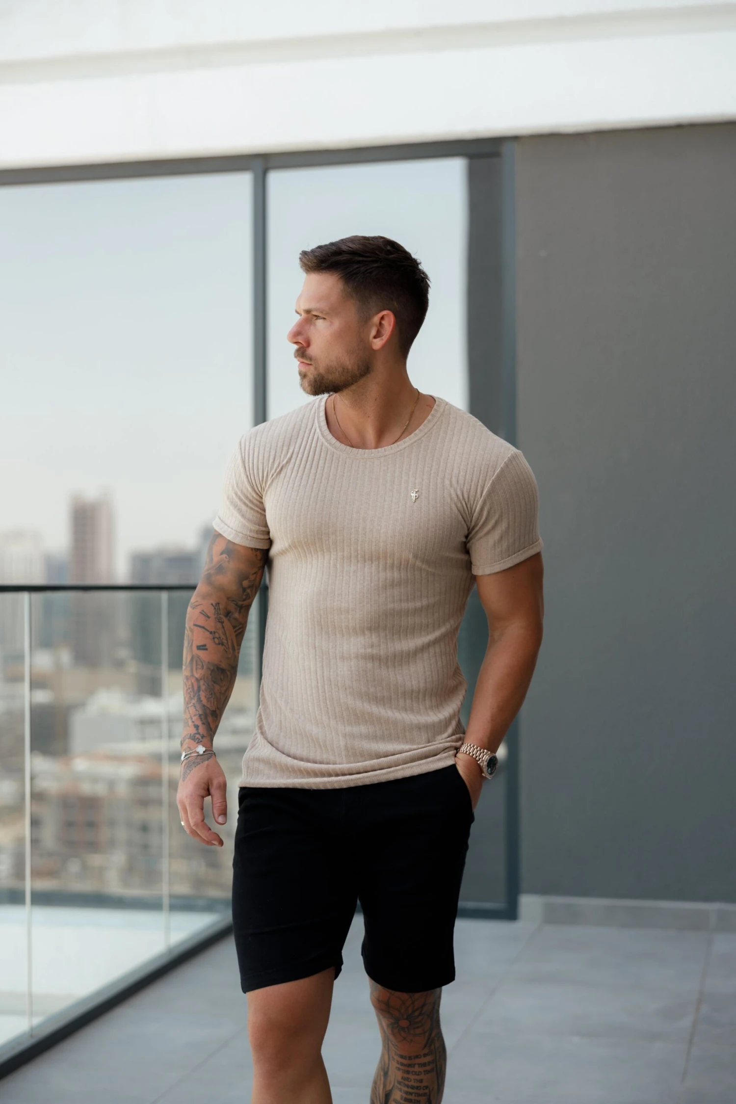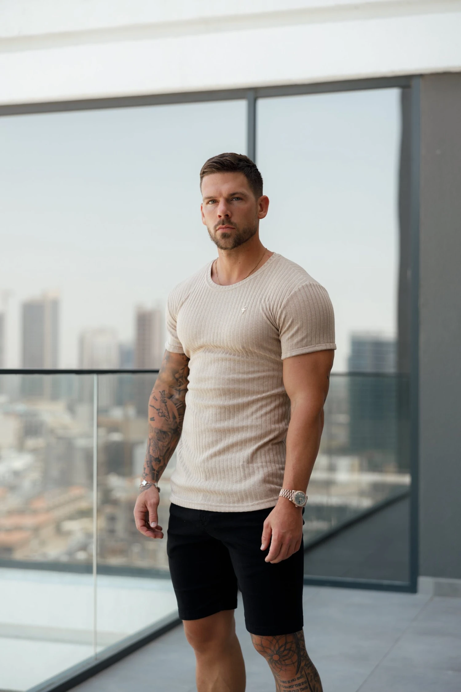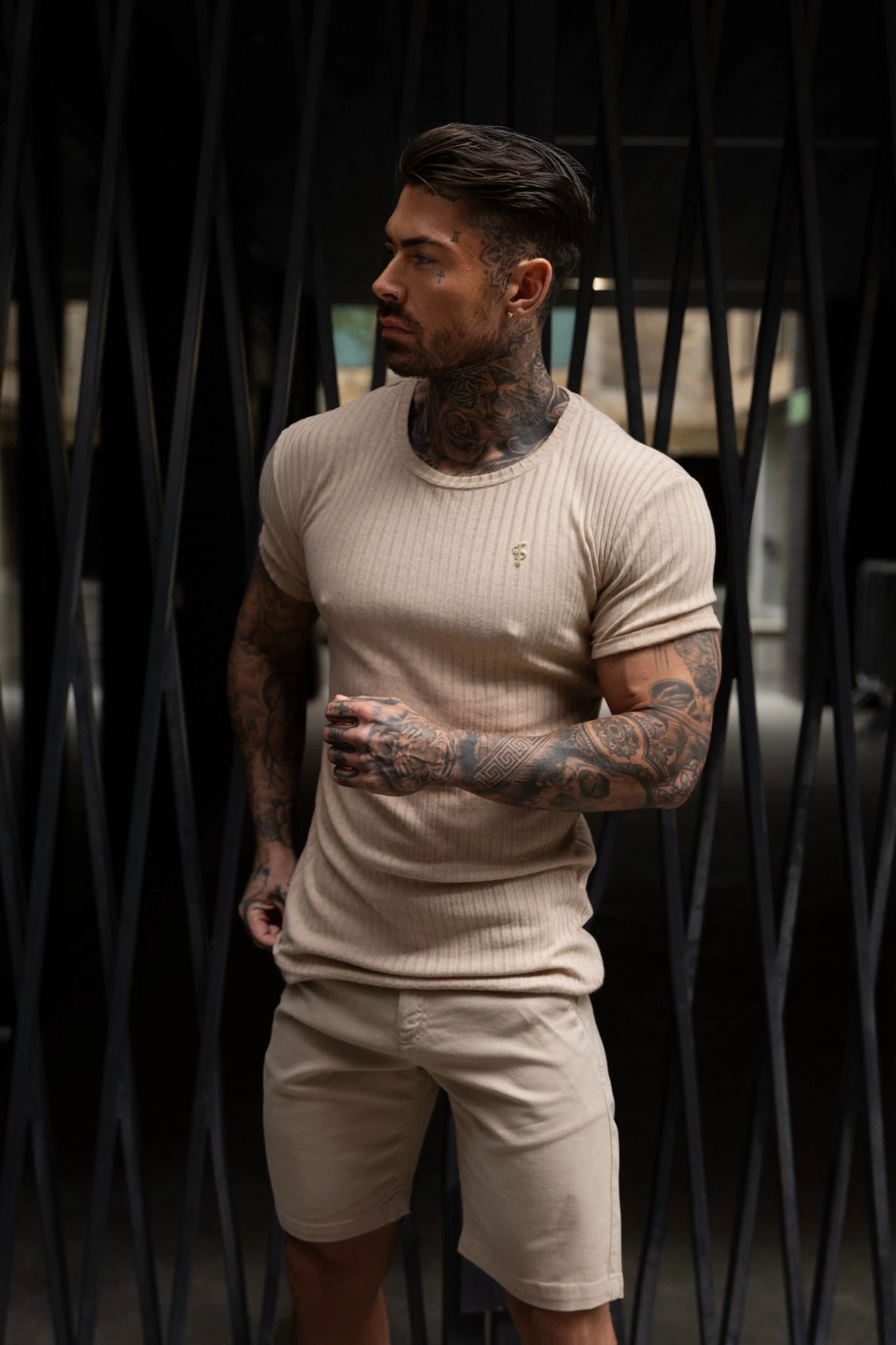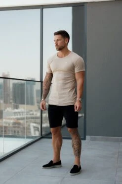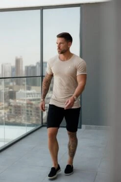 Father Sons Classic Beige / Silver Ribbed Knit Super Slim Short Sleeve Crew – FSH1088