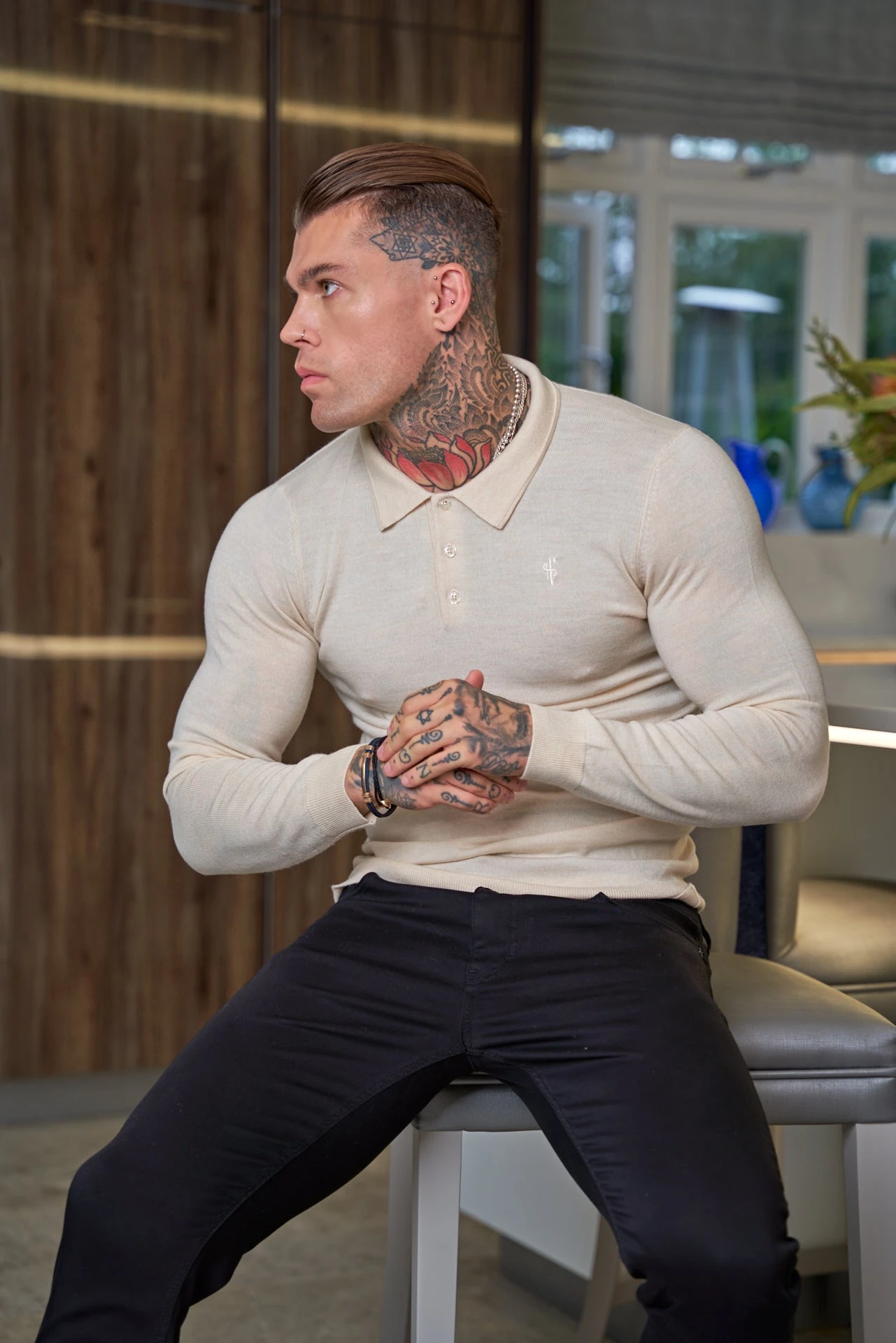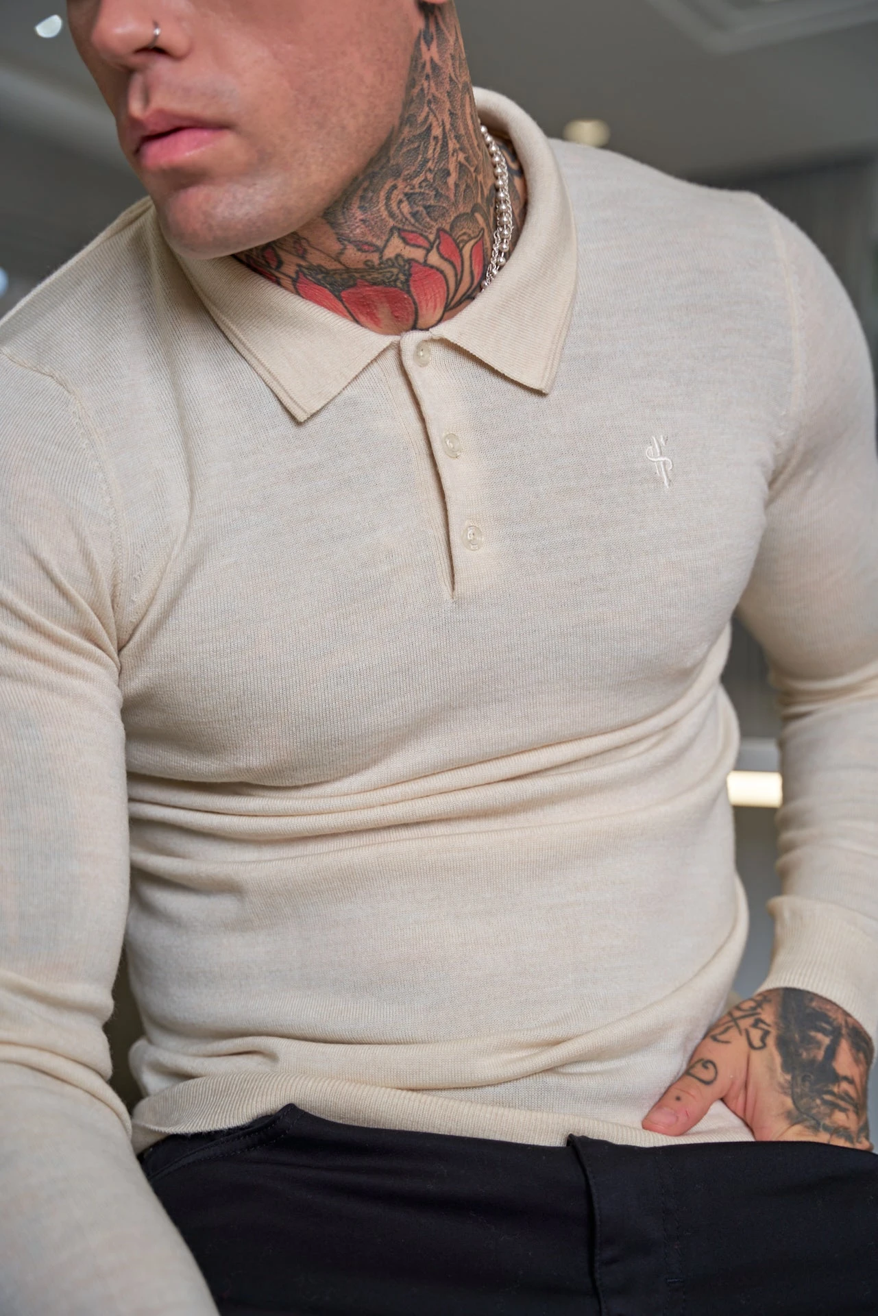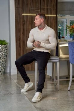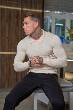 Father Sons Classic Beige Merino Wool Knitted Polo Jumper With FS Embroidery – FSN016