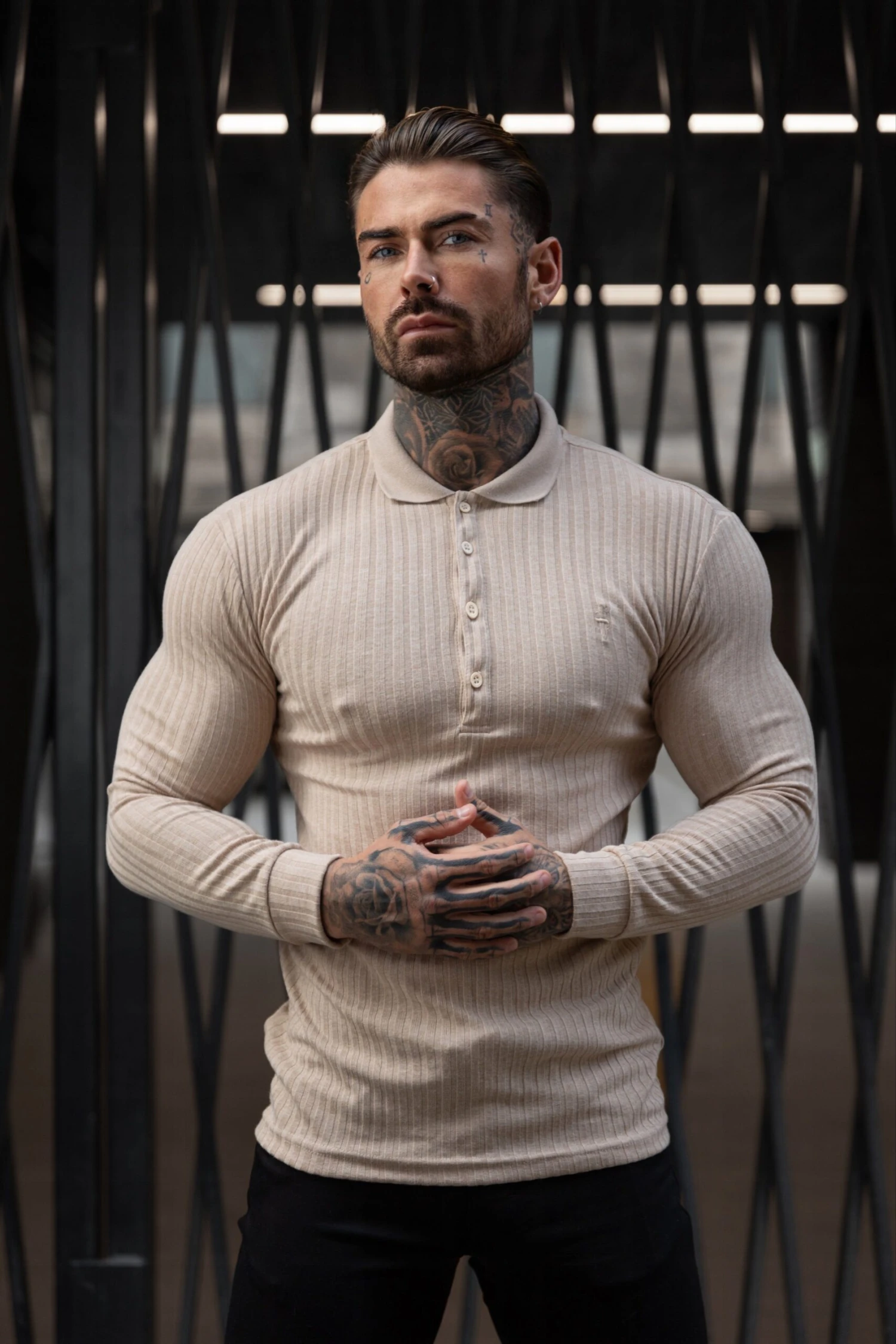 Father Sons Classic Beige Ribbed Polo Shirt Long Sleeve – FSH968