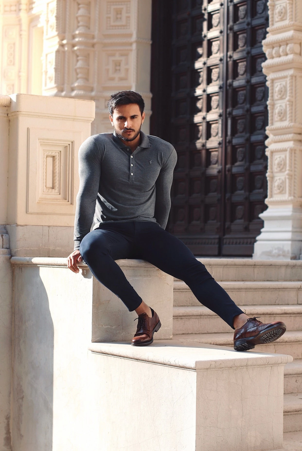 Father Sons Classic Dark Grey Long Sleeve Polo Shirt with Silver Metal Emblem Decal & Buttons – FSH519