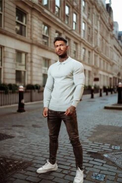 Father Sons Classic Grey Merino Wool Knitted Zip Polo Jumper With FS Embroidery – FSN009