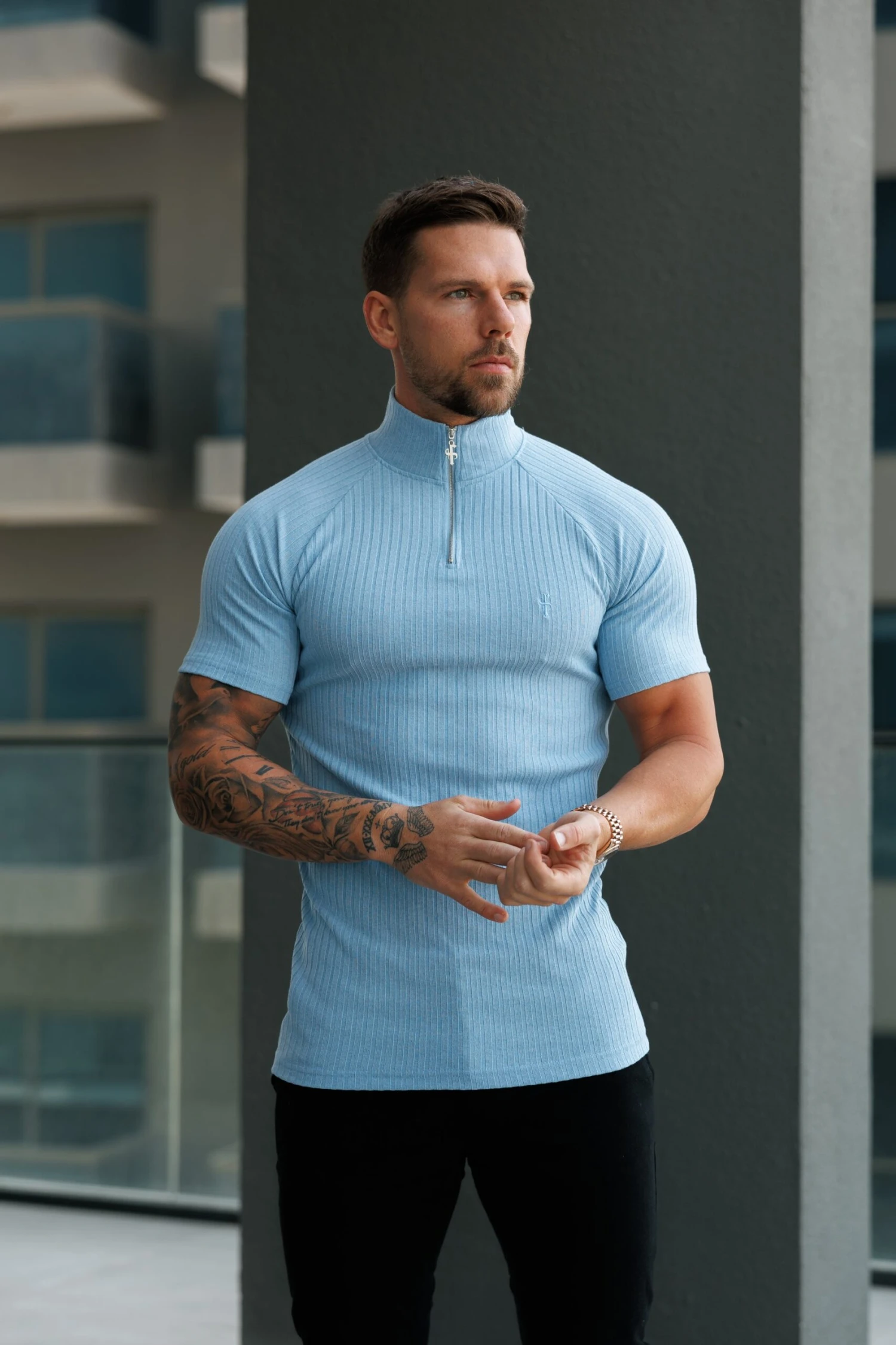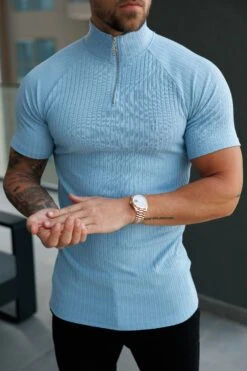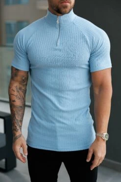Father Sons Classic Light Blue Ribbed Zip Funnel Neck Raglan Short Sleeve Crew – FSH1291