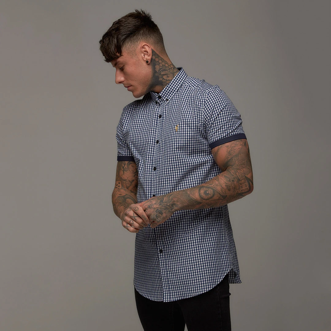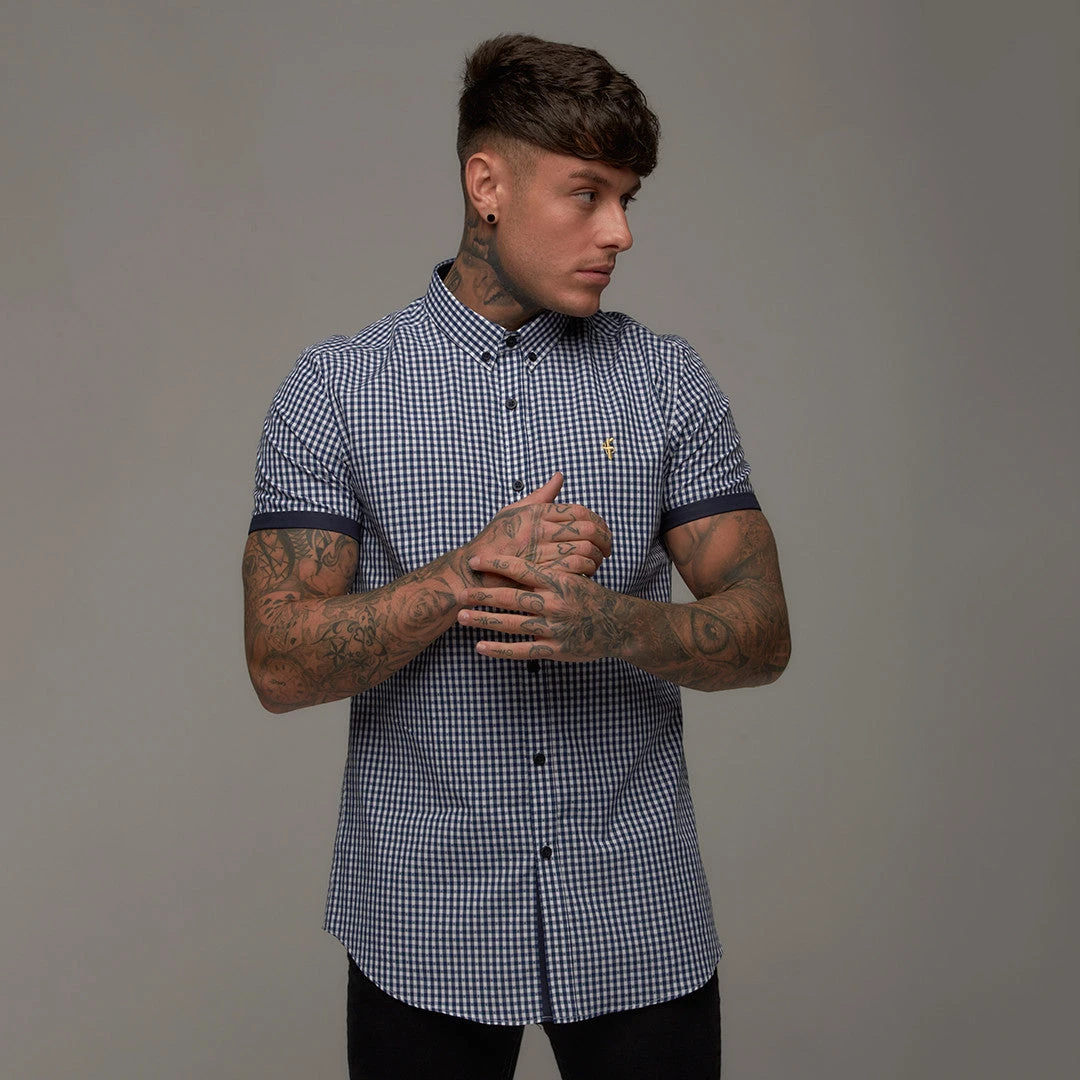Father Sons Classic Navy White Gingham Dobby Short Sleeve (Gold Emblem) – FS243