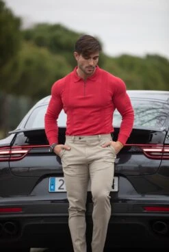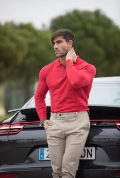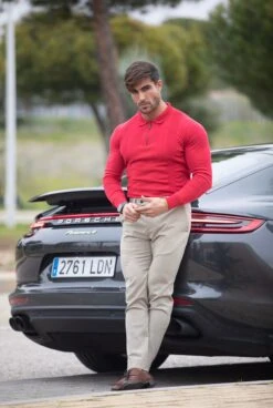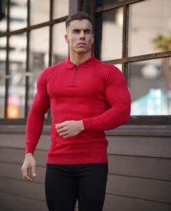 Father Sons Classic Poppy Red and Black Zip Knitted Short Sleeve Polo Shirt – FSH567