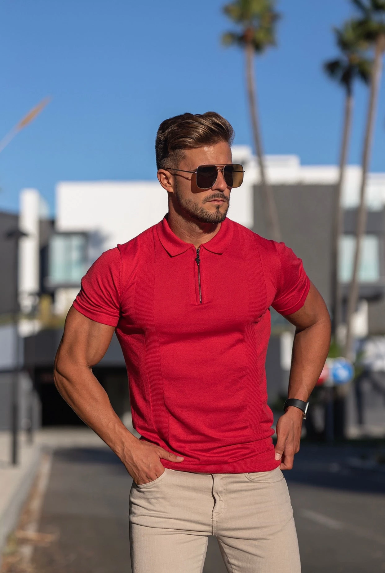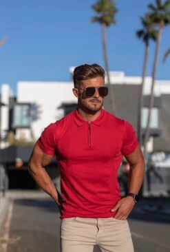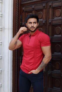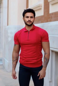 Father Sons Classic Red and Black Zip Knitted Short Sleeve Polo – FSH467