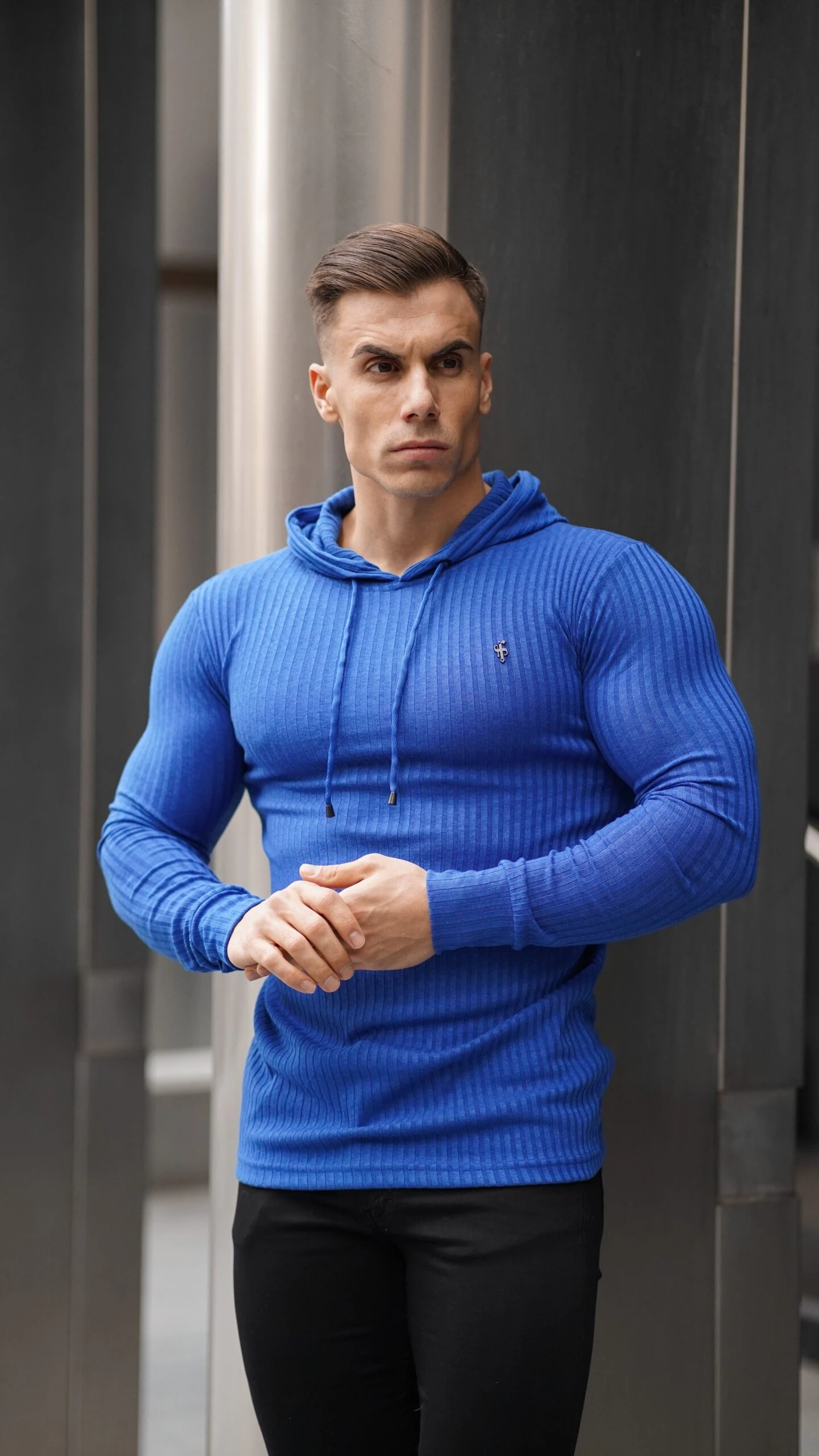 Father Sons Classic Royal Blue Ribbed Knit Hoodie Jumper With Black Emblem – FSH597