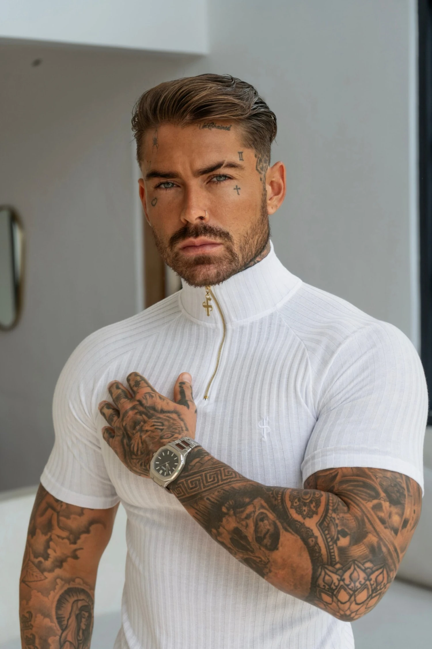 Father Sons Classic White / Gold Ribbed Zip Funnel Neck Raglan Short Sleeve Crew – FSH1266