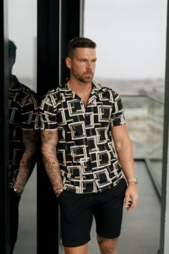 Father Sons Hawaiian Boxy Black / Cream Interlinked Square Stretch with Revere Collar Short Sleeve – FS997