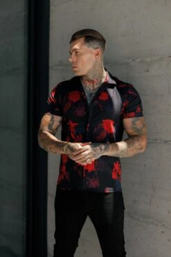 Father Sons Hawaiian Boxy Black / Red Print Stretch with Revere Collar Short Sleeve – FS994