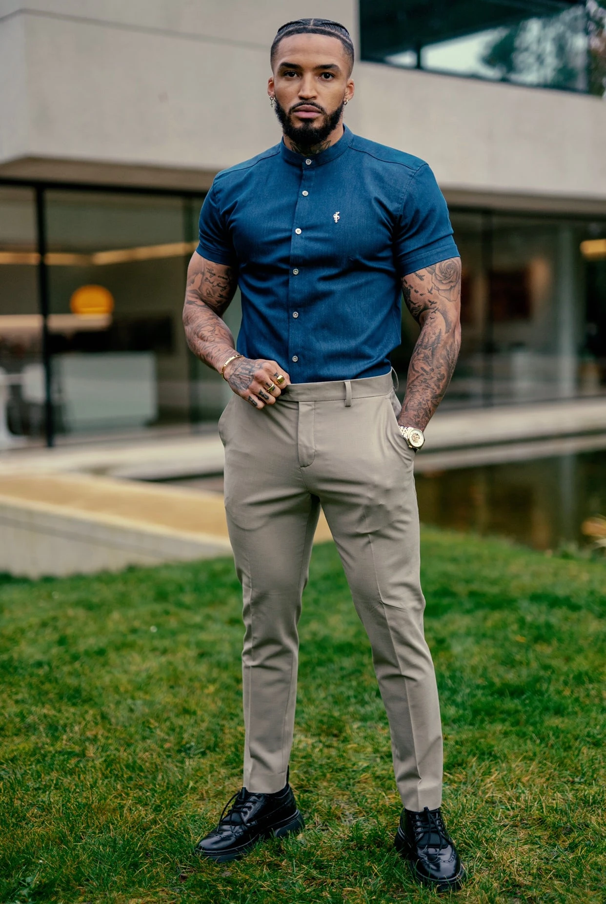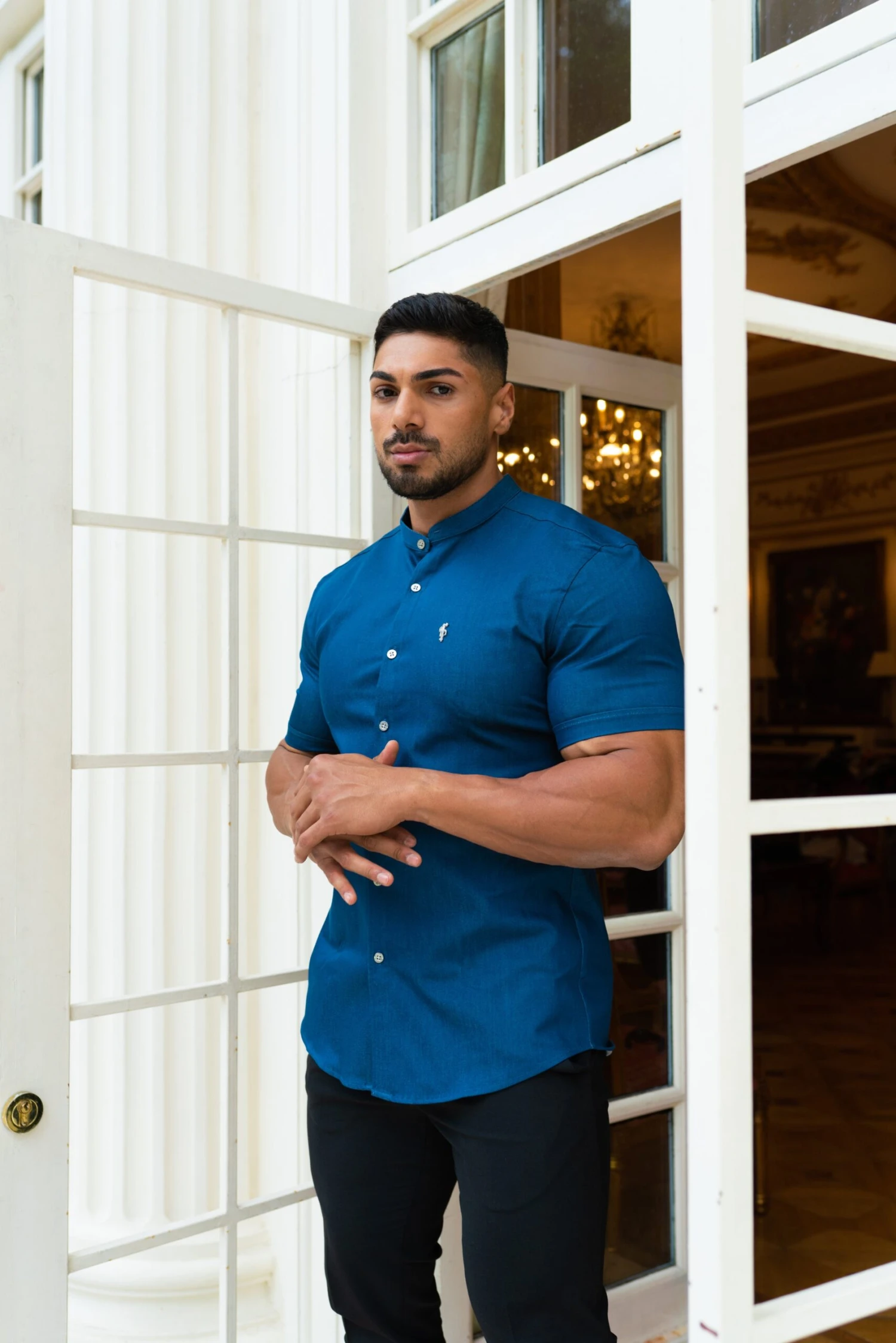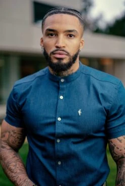 Father Sons Super Slim Stretch Aegean Blue Short Sleeve Grandad collar with Metal Buttons and Decal Emblem – FS776