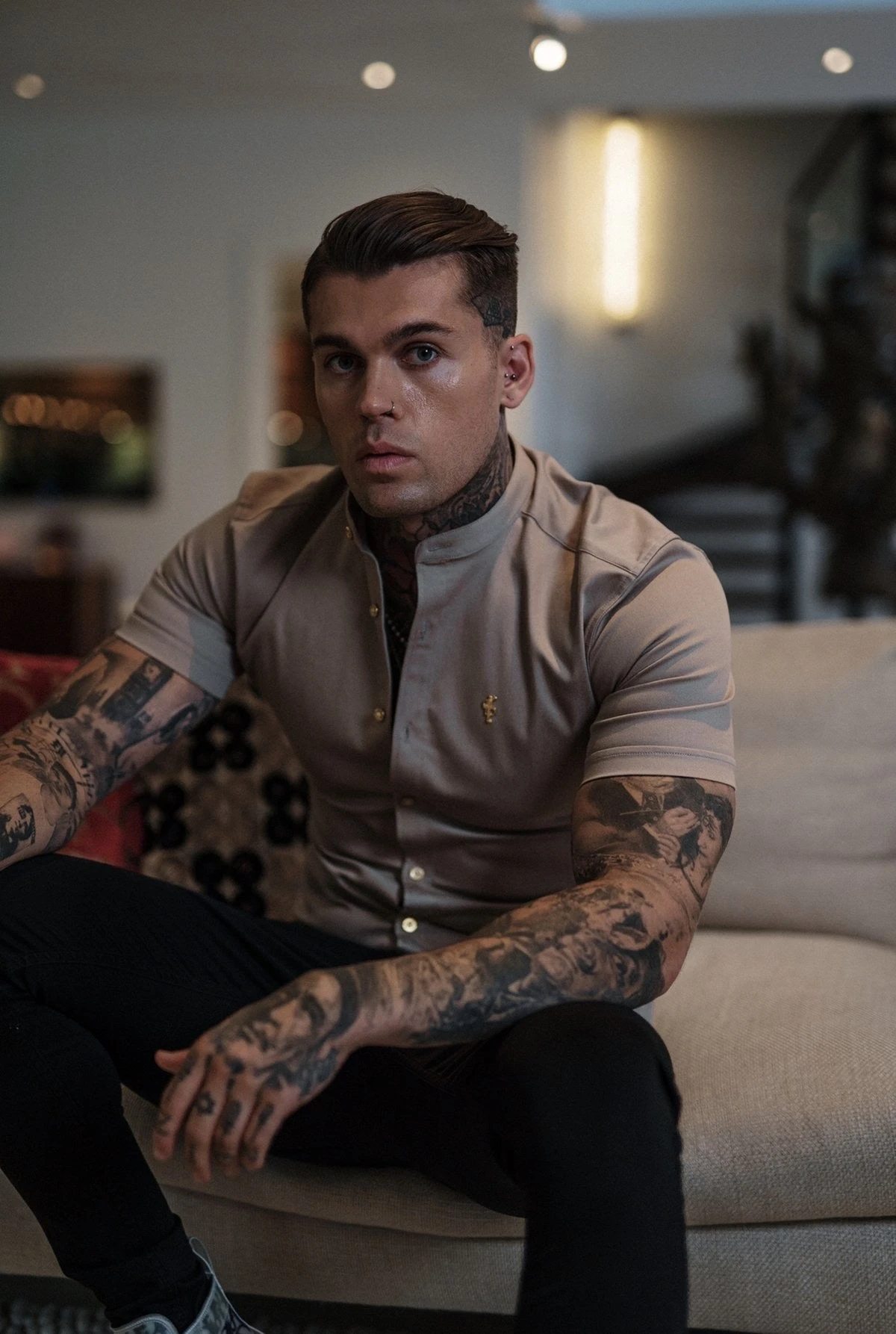 Father Sons Super Slim Stretch Beige Denim Short Sleeve Grandad collar with Gold Metal Buttons and Decal Emblem – FS764