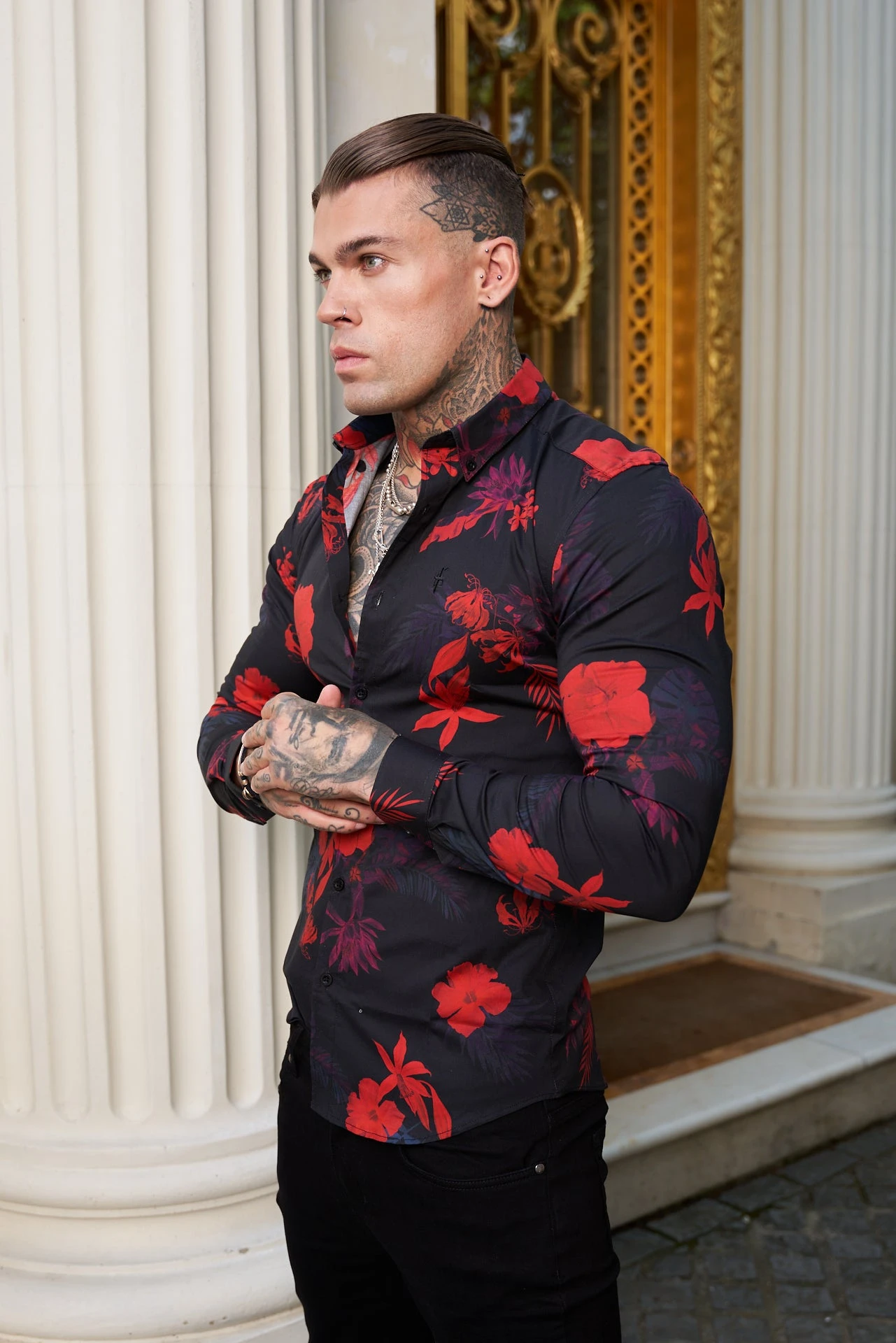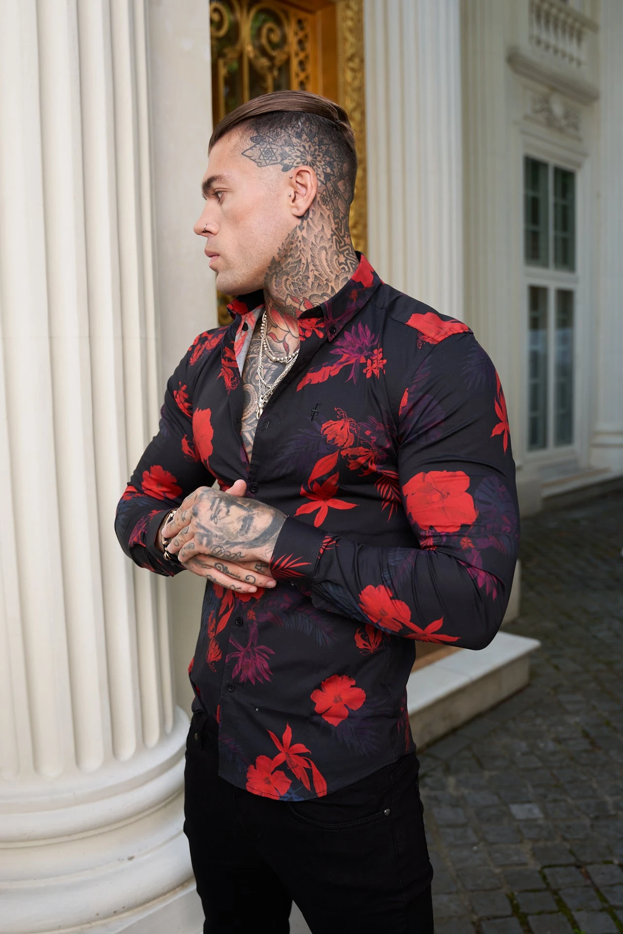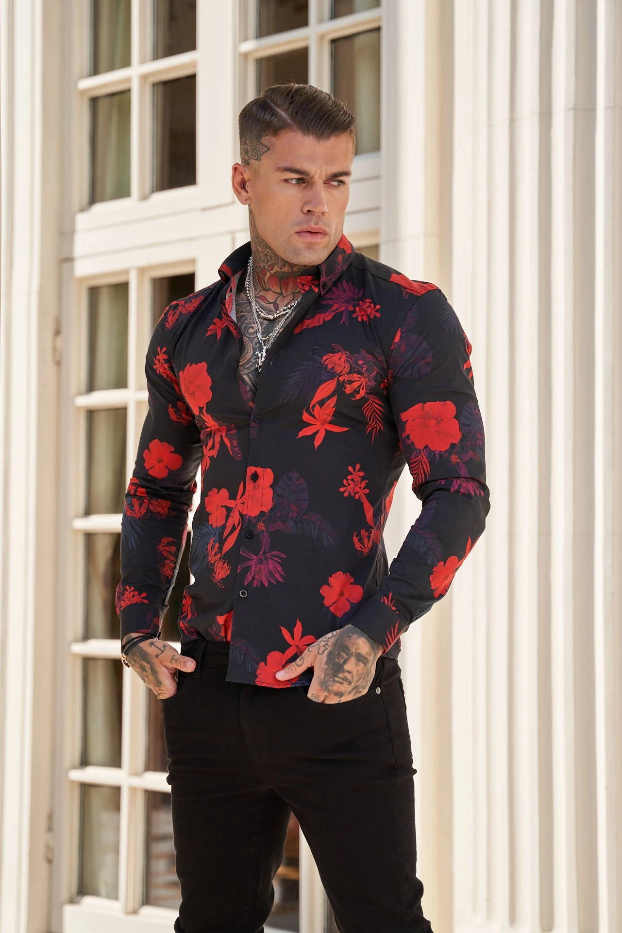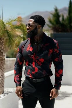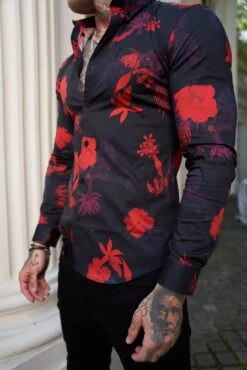 Father Sons Super Slim Stretch Black and Red Floral Print Long Sleeve with Button Down Collar – FS770