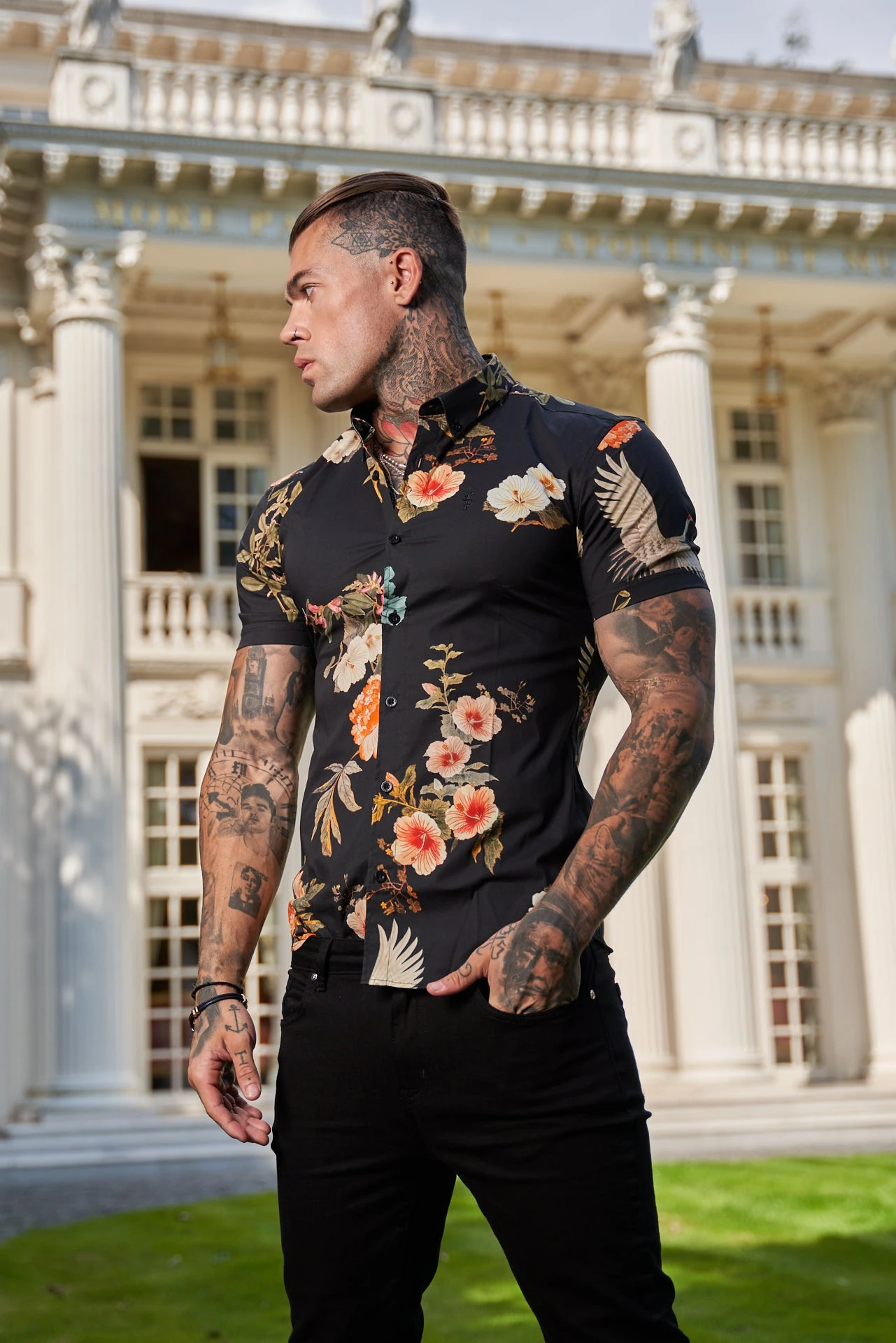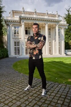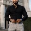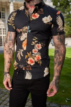 Father Sons Super Slim Stretch Black Crane Print Short Sleeve with Button Down Collar – FS768