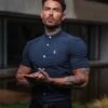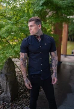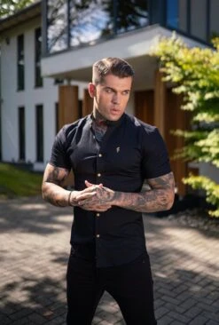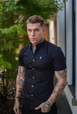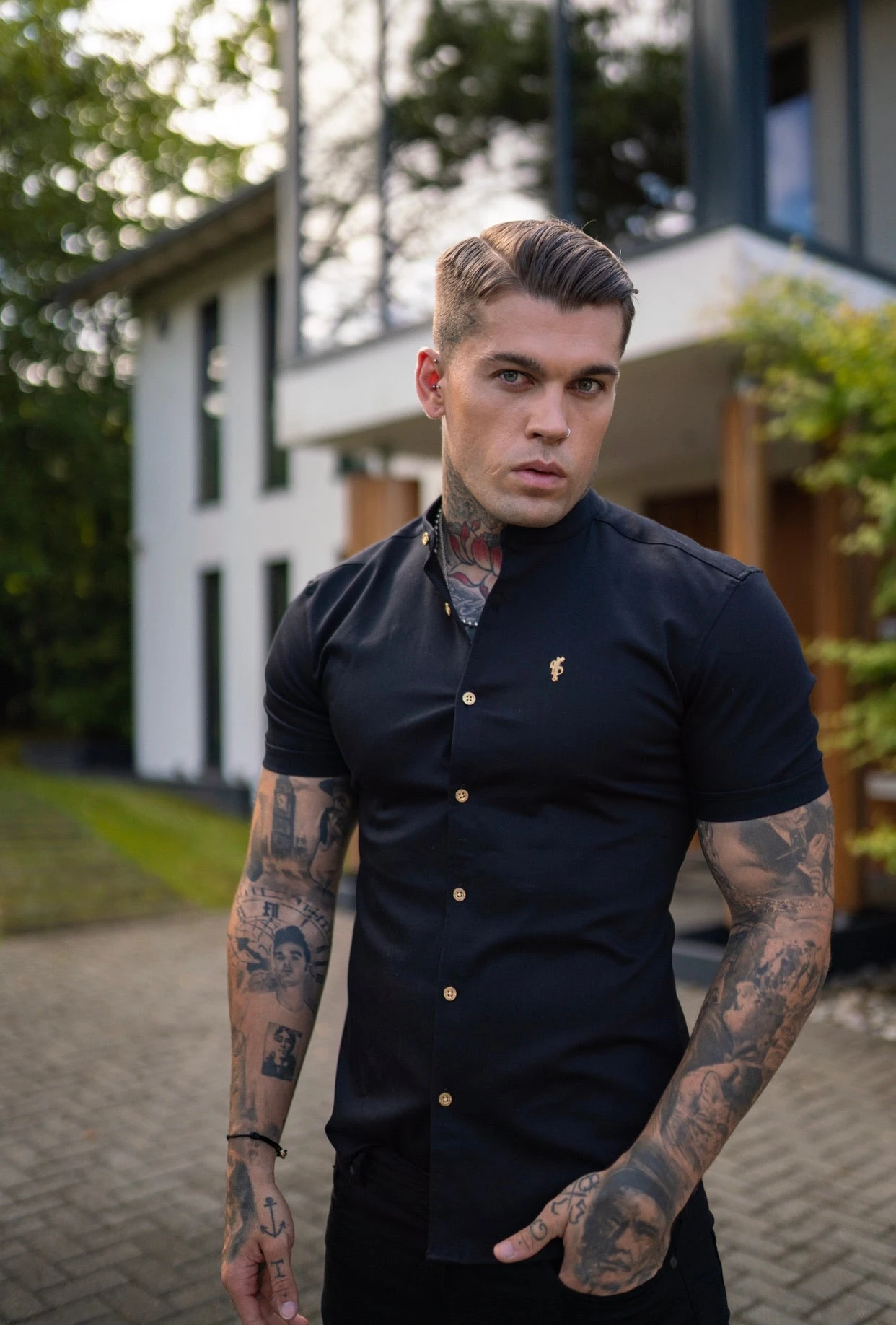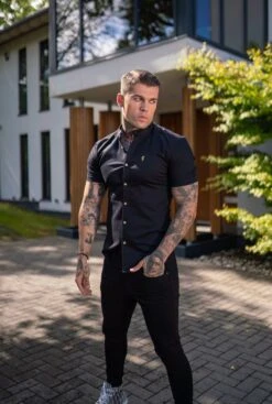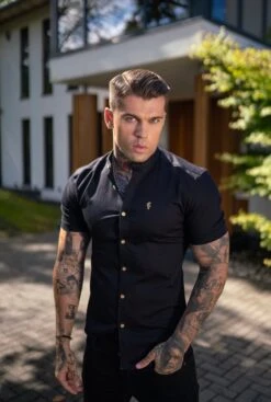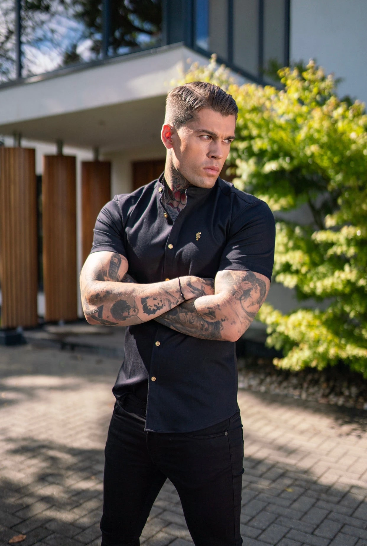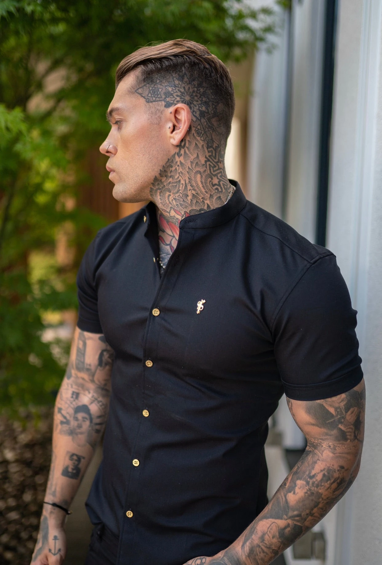 Father Sons Super Slim Stretch Black Denim Short Sleeve Grandad collar with Metal Buttons and Decal Emblem – FS708