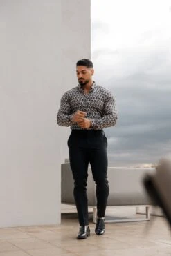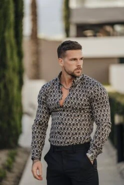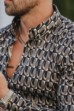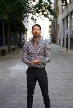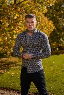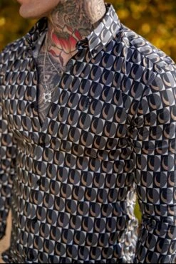 Father Sons Super Slim Stretch Black Multi Retro Print Long Sleeve with Button Down Collar – FS910