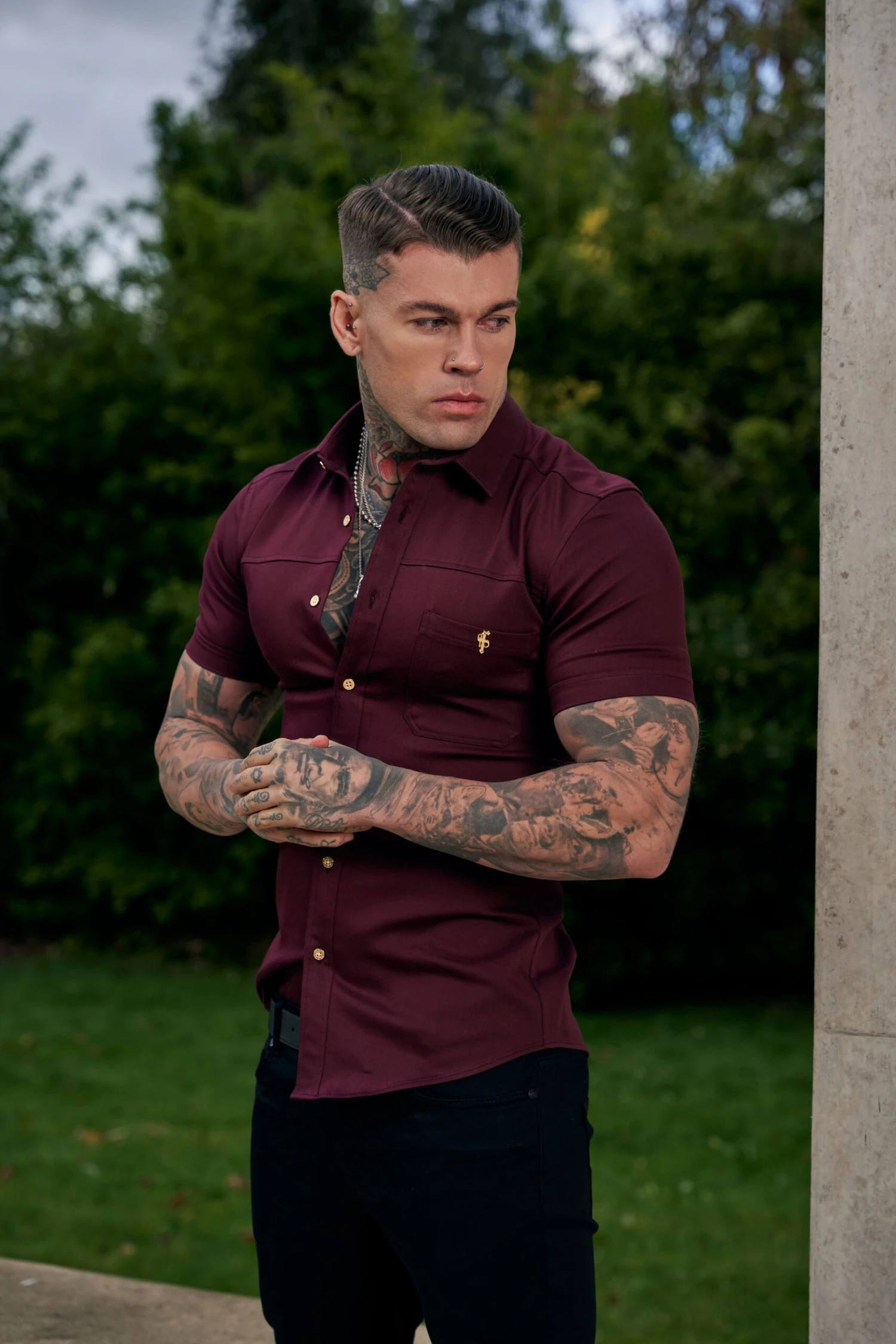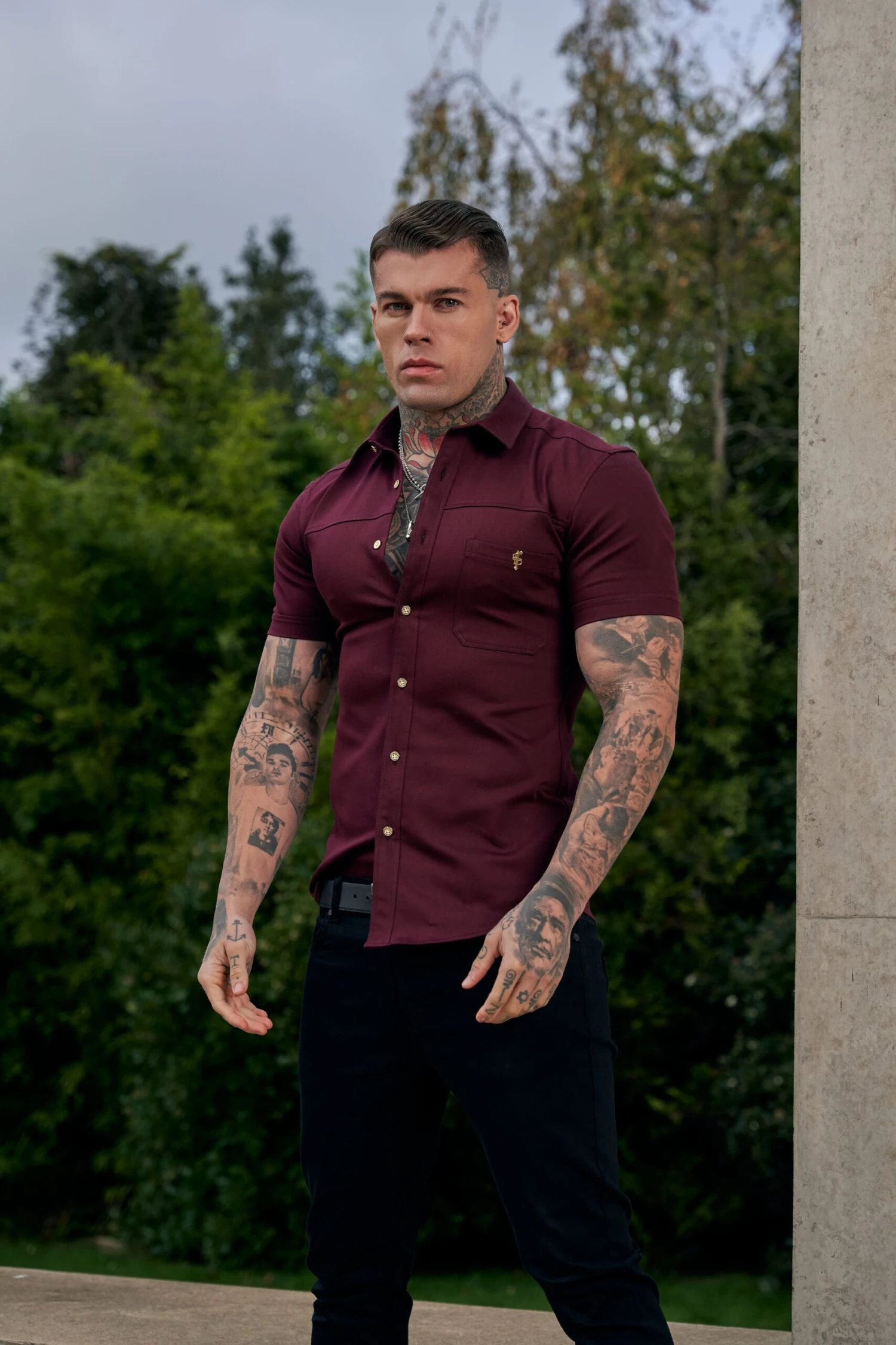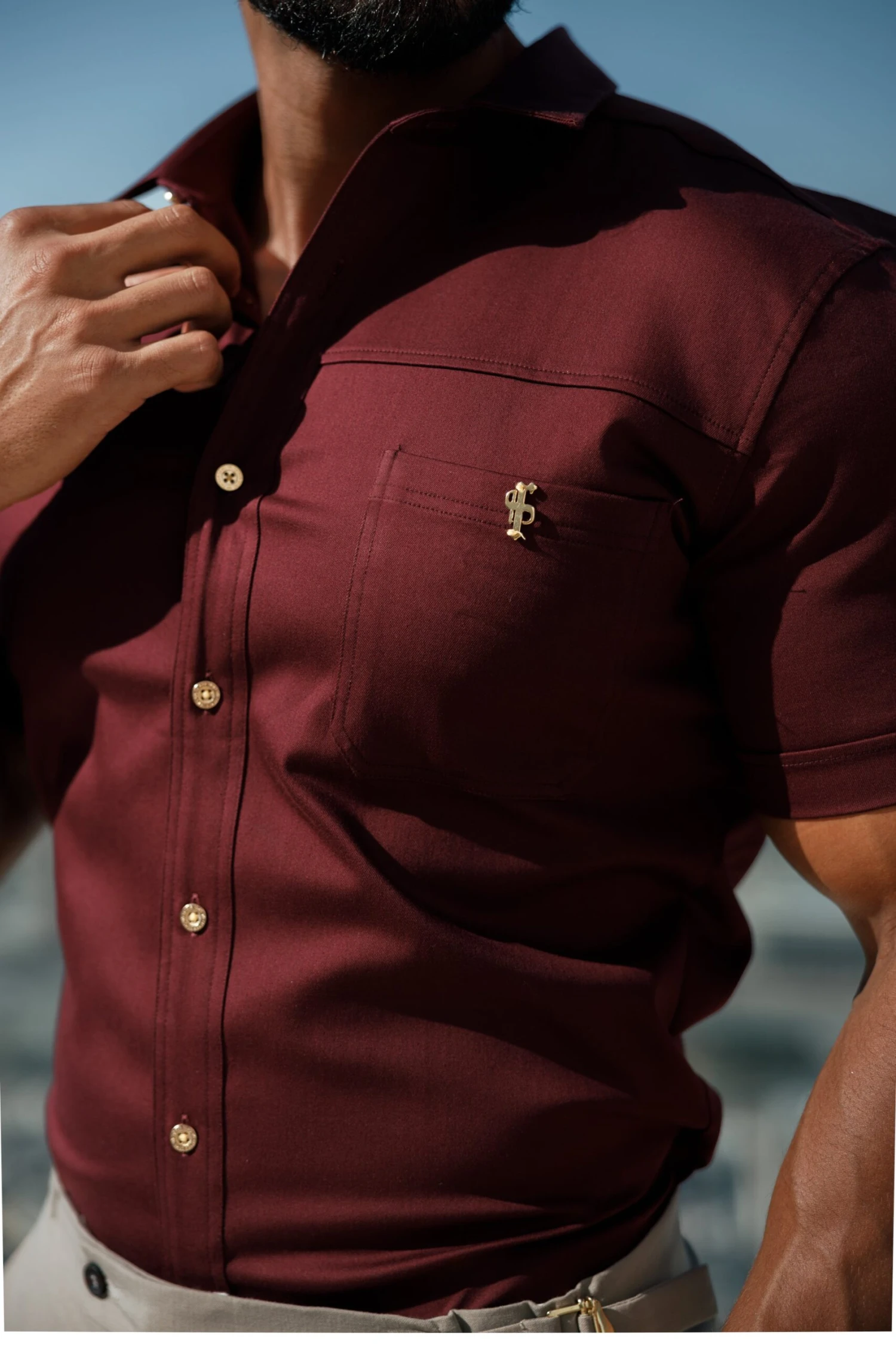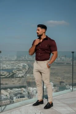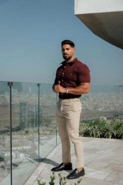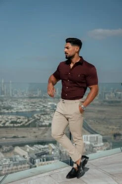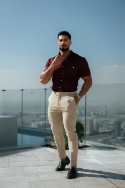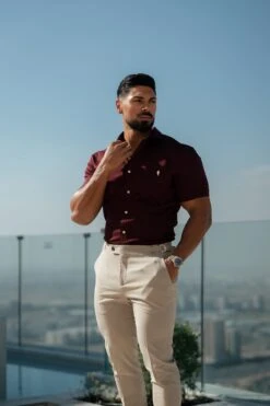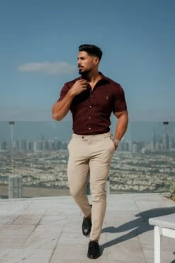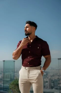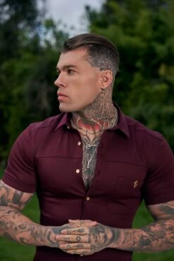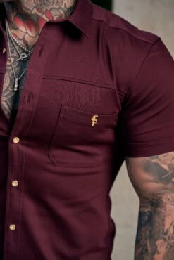Father Sons Super Slim Stretch Burgundy Denim Short Sleeve with Horizontal Seam and Pocket – FS961