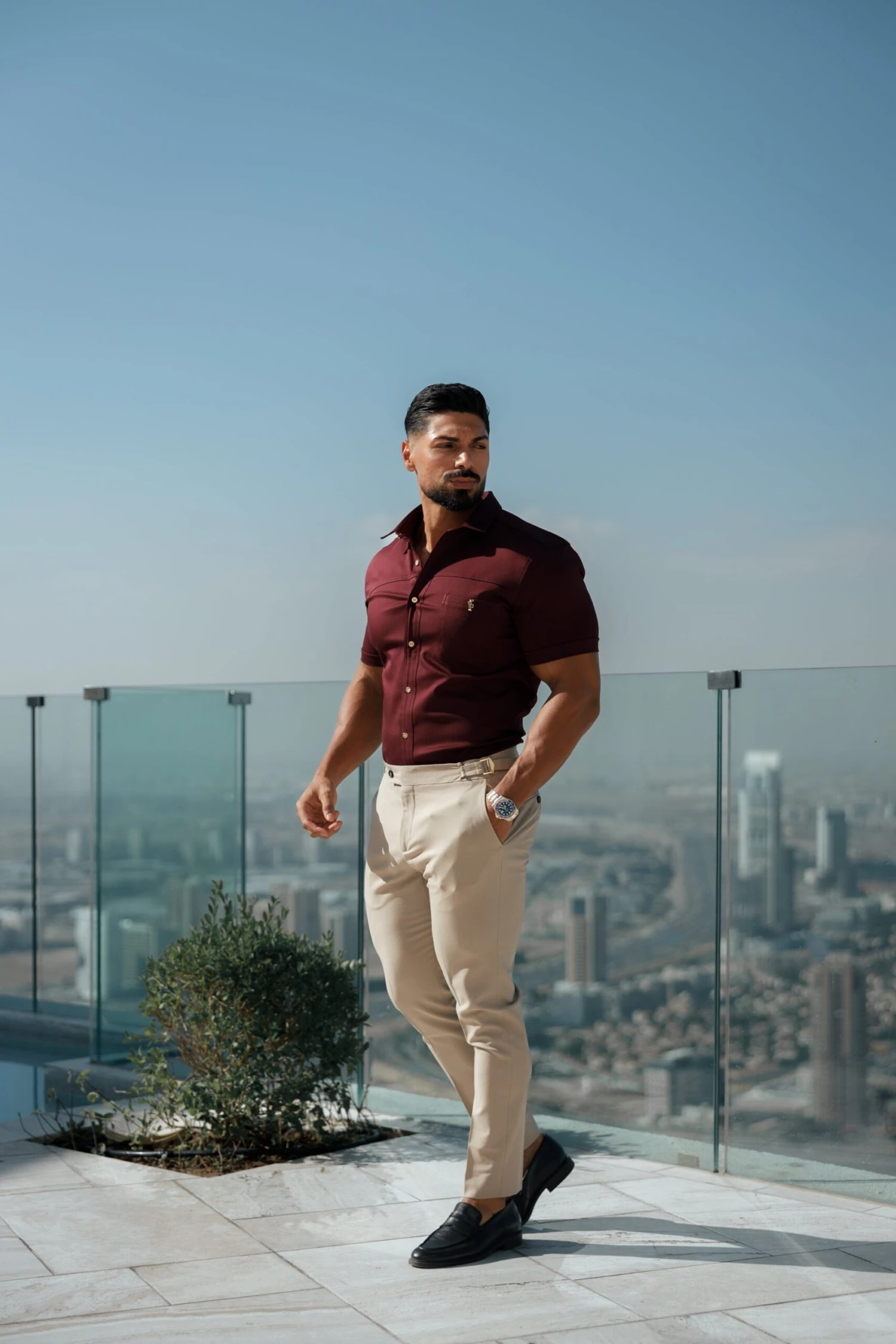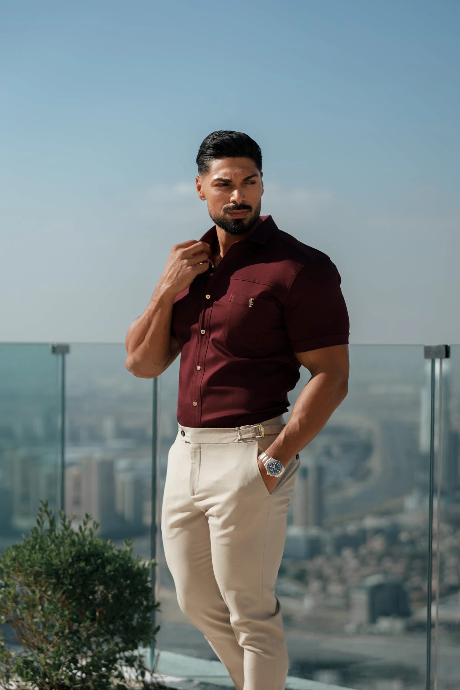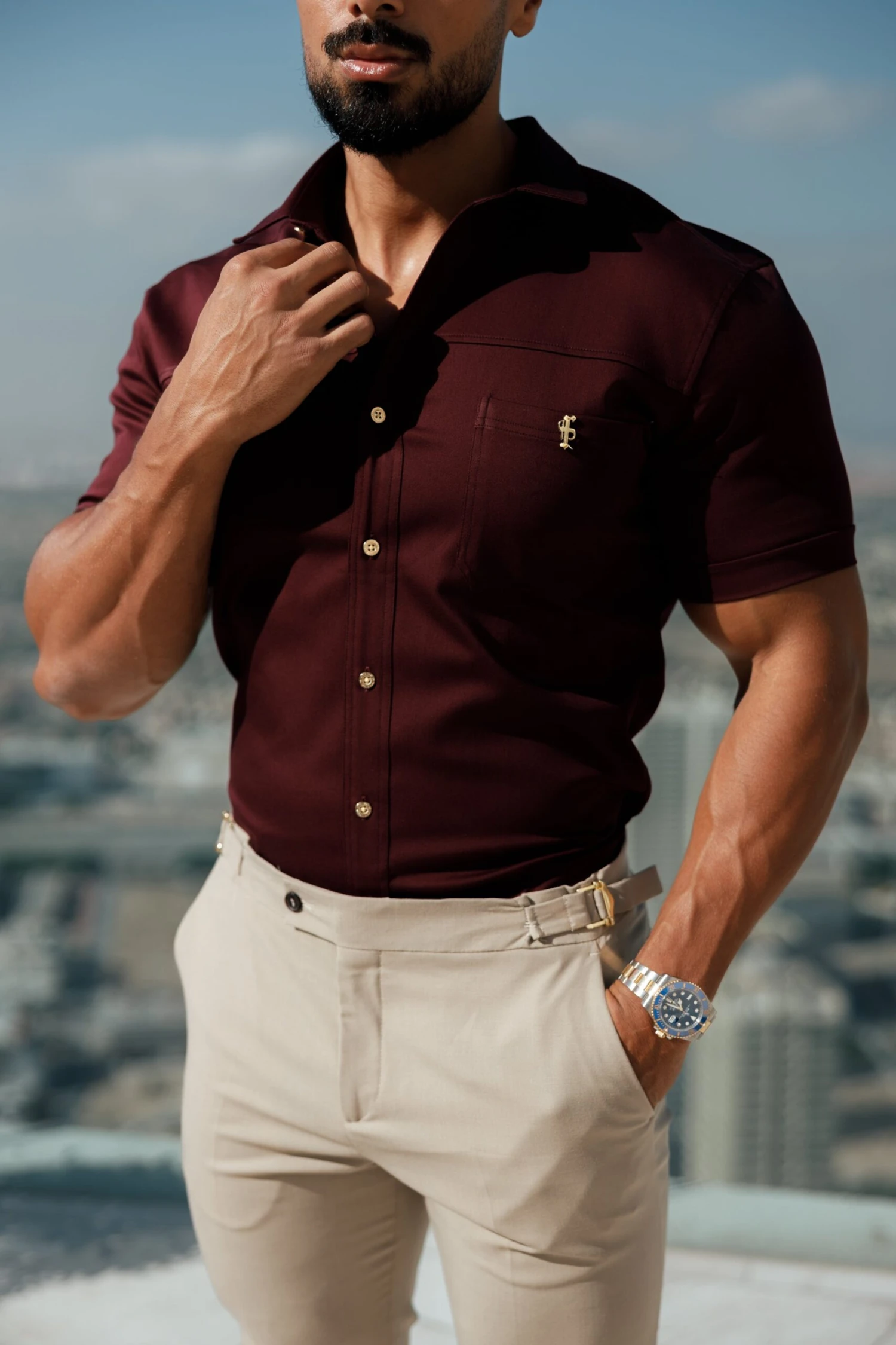 Father Sons Super Slim Stretch Burgundy Denim Short Sleeve with Horizontal Seam and Pocket – FS961