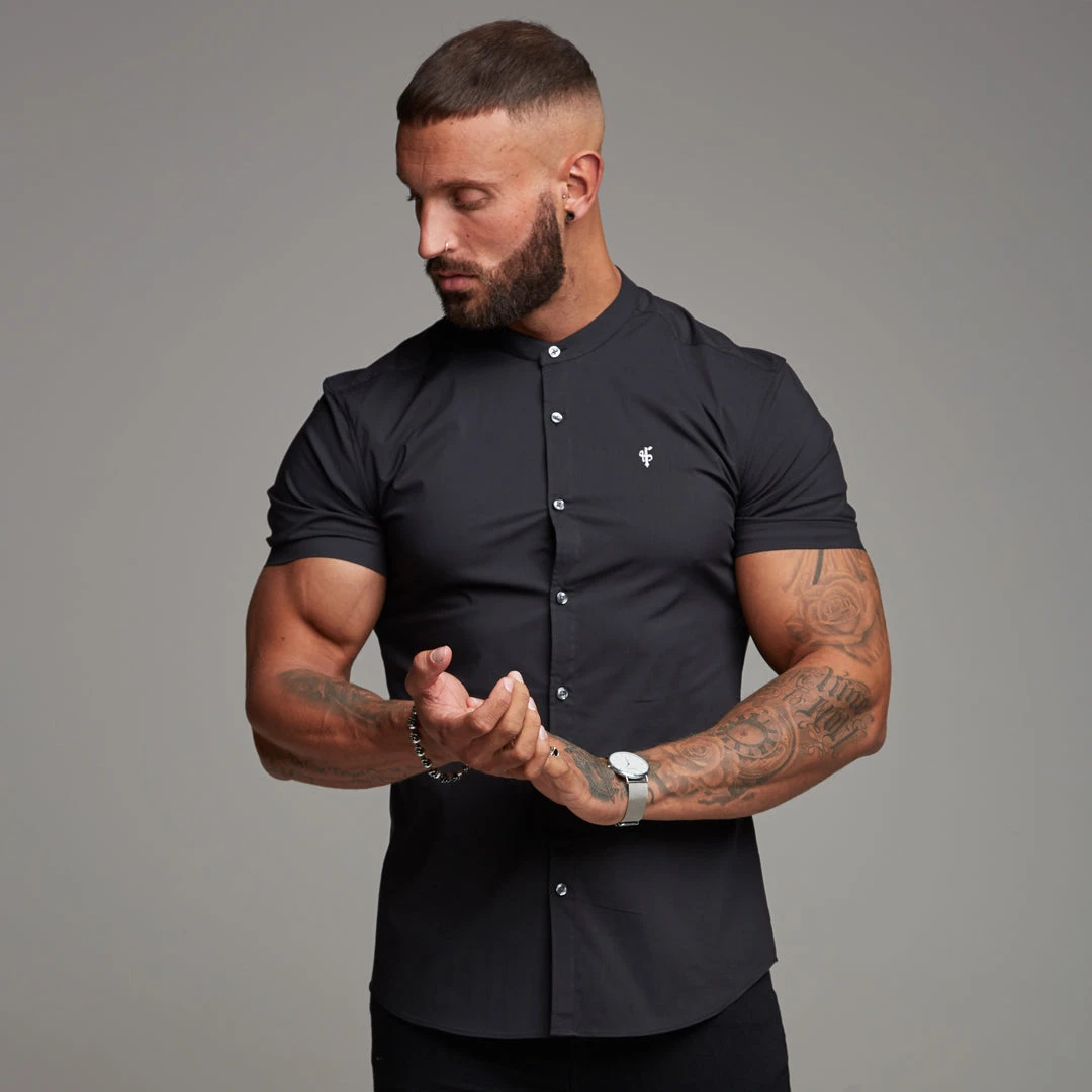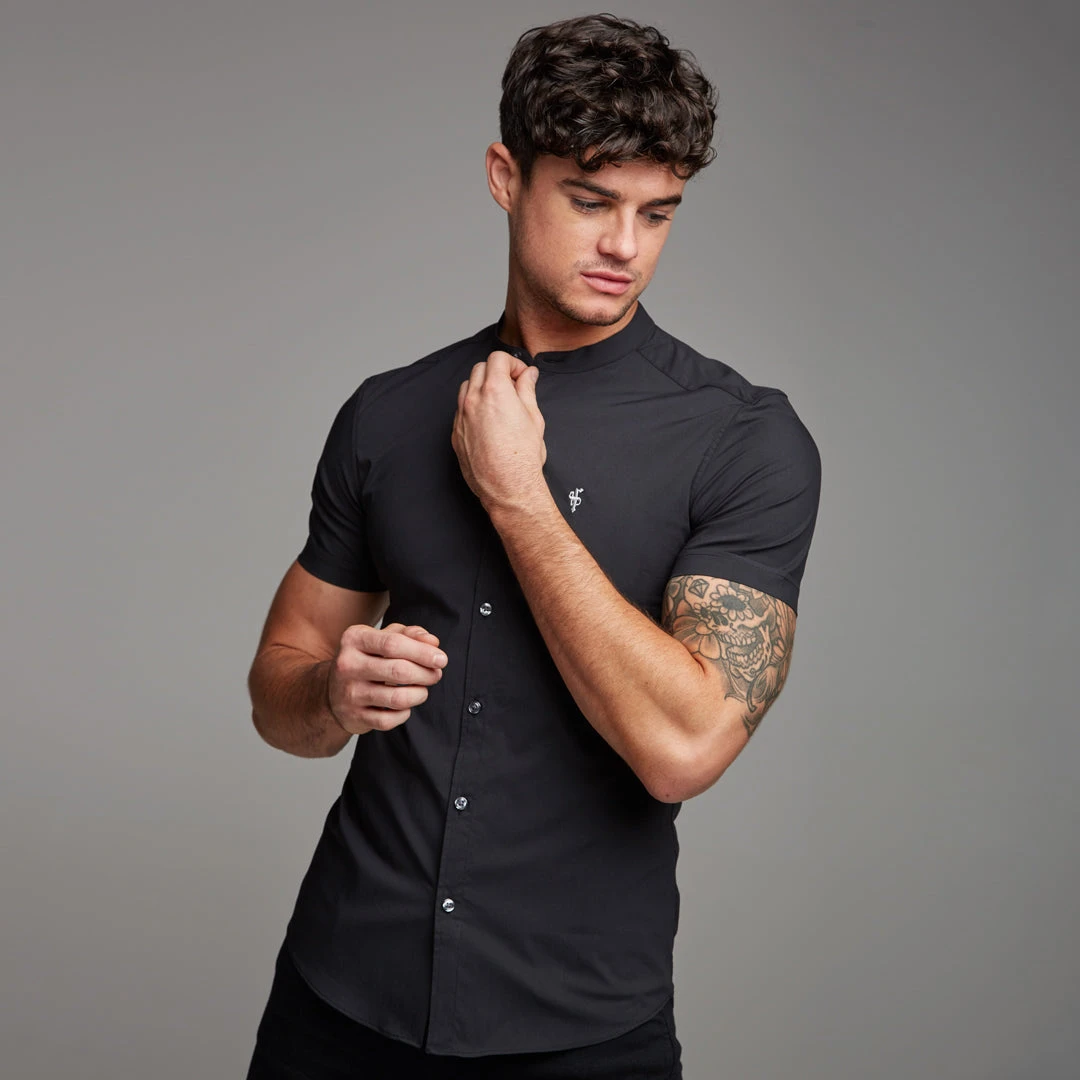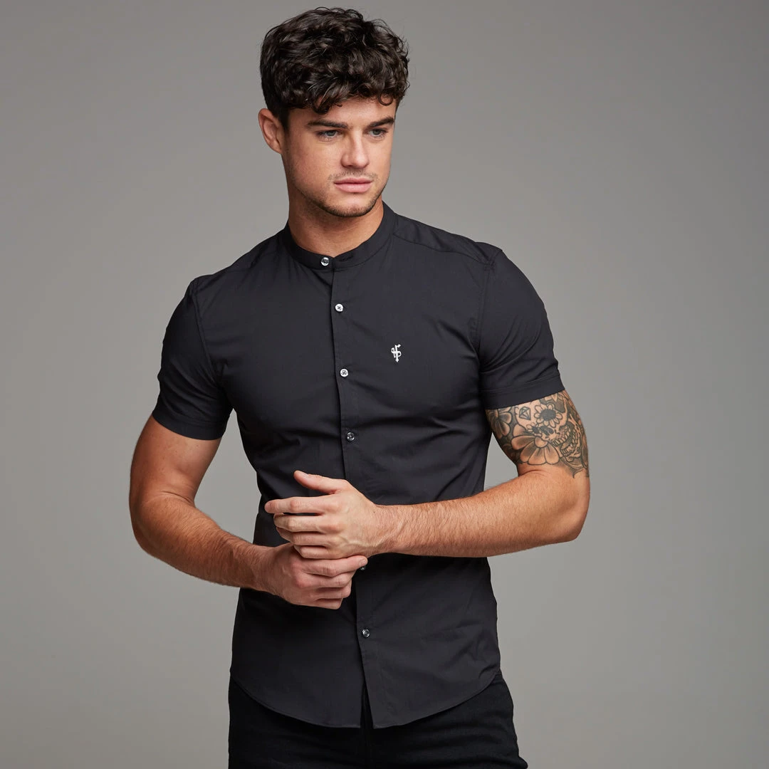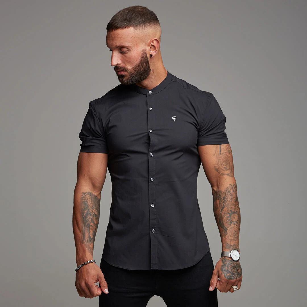 Father Sons Super Slim Stretch Classic Black Grandad Collar Short Sleeve