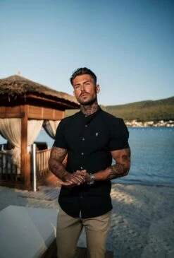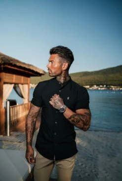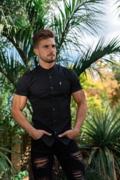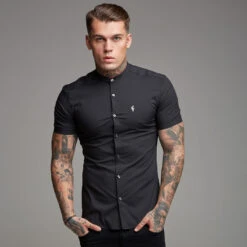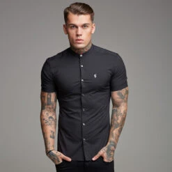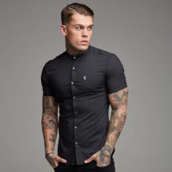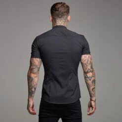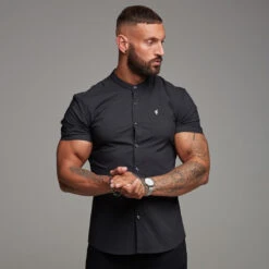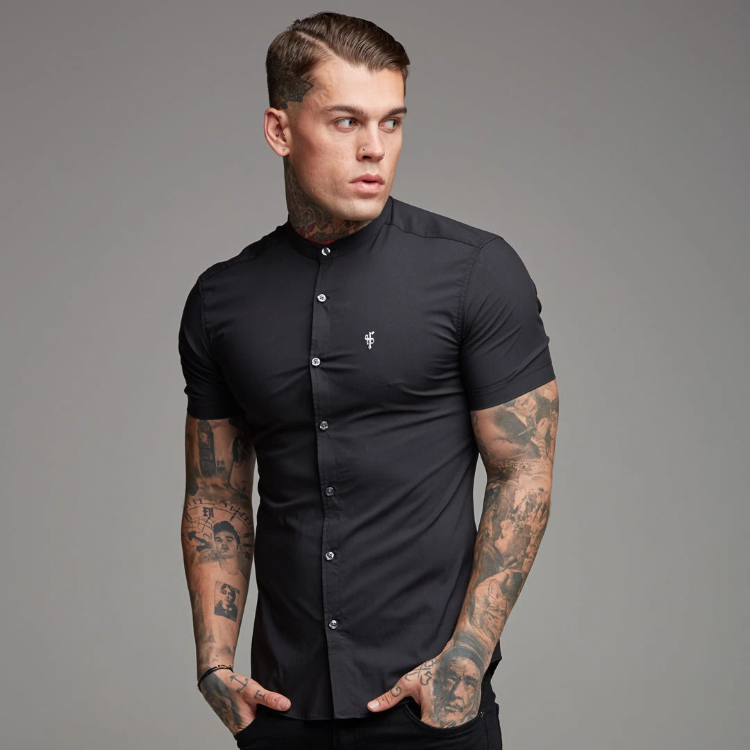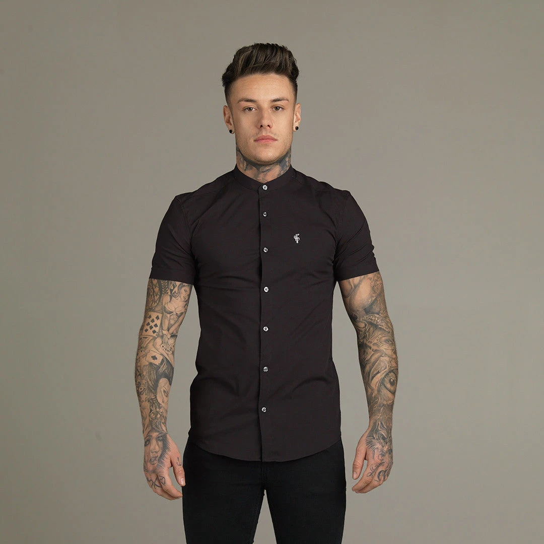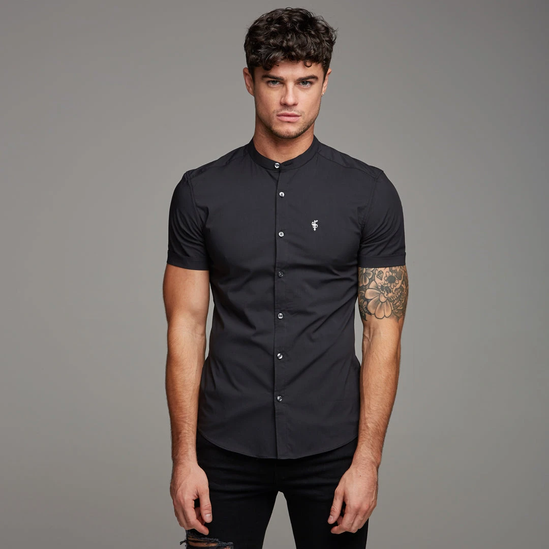 Father Sons Super Slim Stretch Classic Black Grandad Collar Short Sleeve