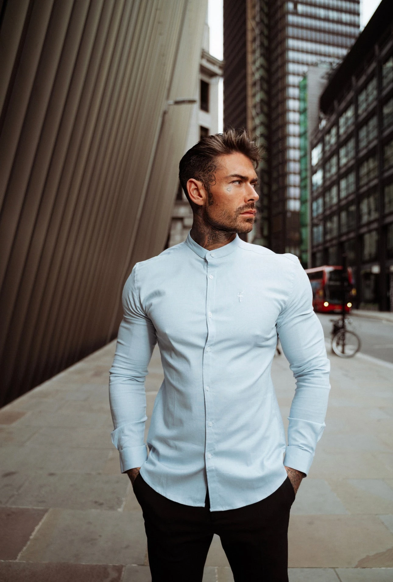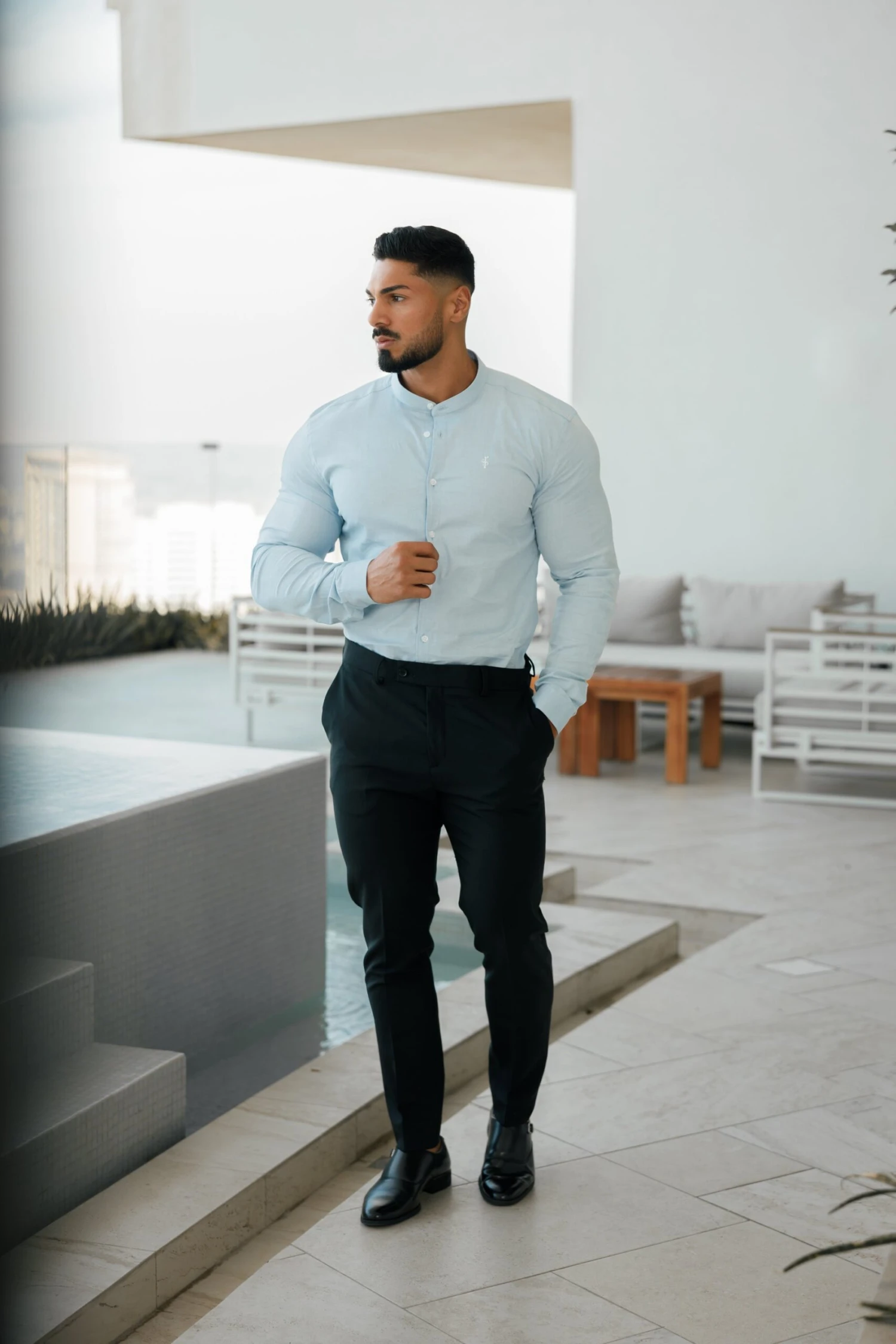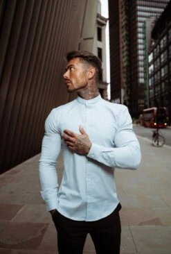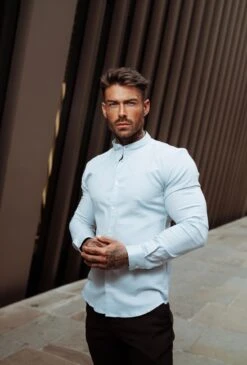 Father Sons Super Slim Stretch Classic Oxford Light Blue with Grandad Collar –Â FS938