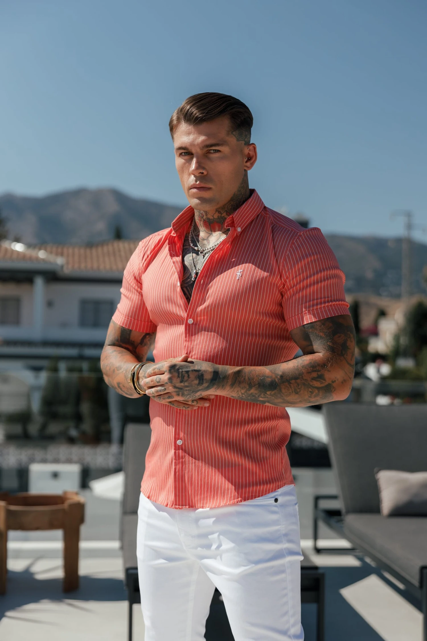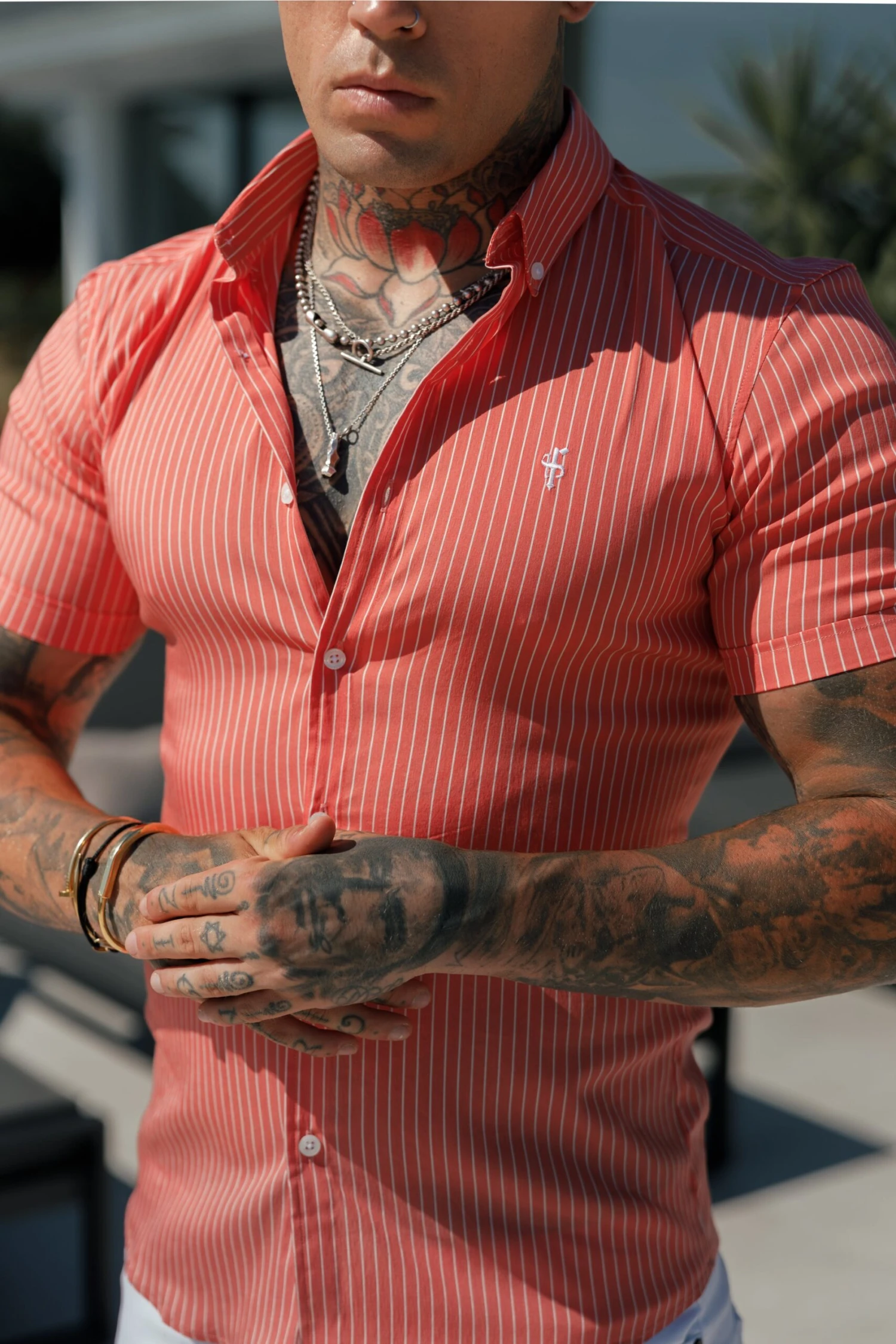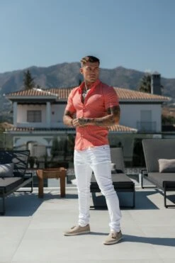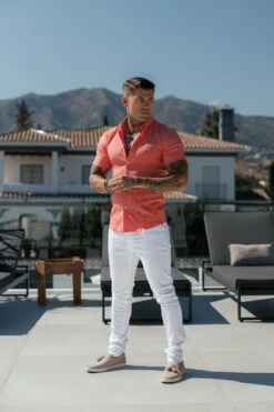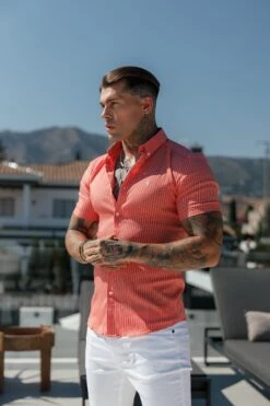 Father Sons Super Slim Stretch Coral Printed Pinstripe Short Sleeve with Button Down Collar – FS1062