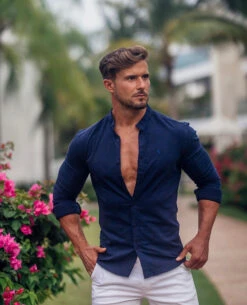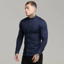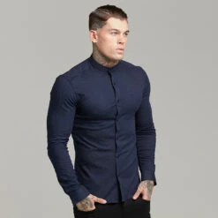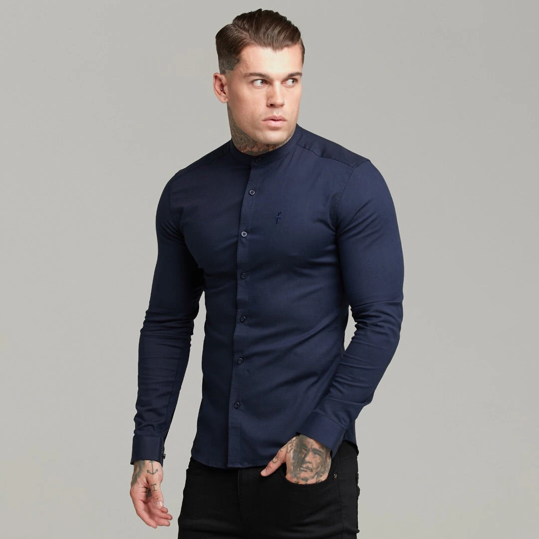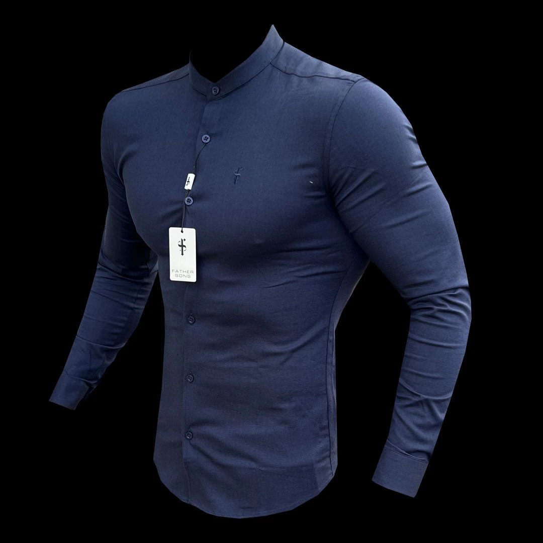 Father Sons Super Slim Stretch Grandad Collar Classic Navy Oxford Long Sleeve – FS583