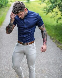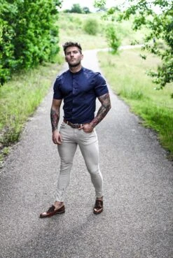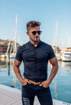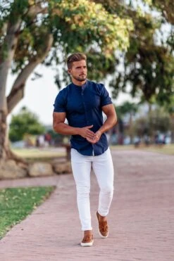 Father Sons Super Slim Stretch Grandad Collar Short Sleeve Classic Navy Oxford – FS584