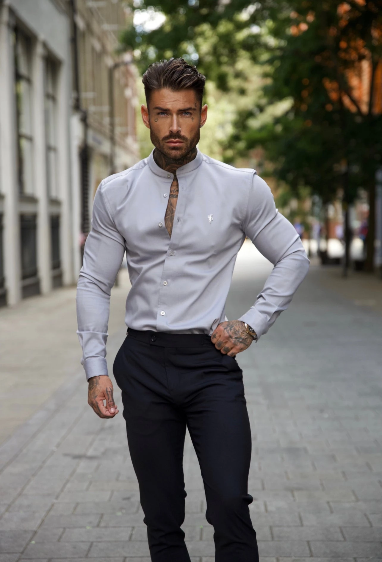 Father Sons Super Slim Stretch Grey Denim Long Sleeve with Grandad Collar and Silver Metal Buttons and Decal FS962