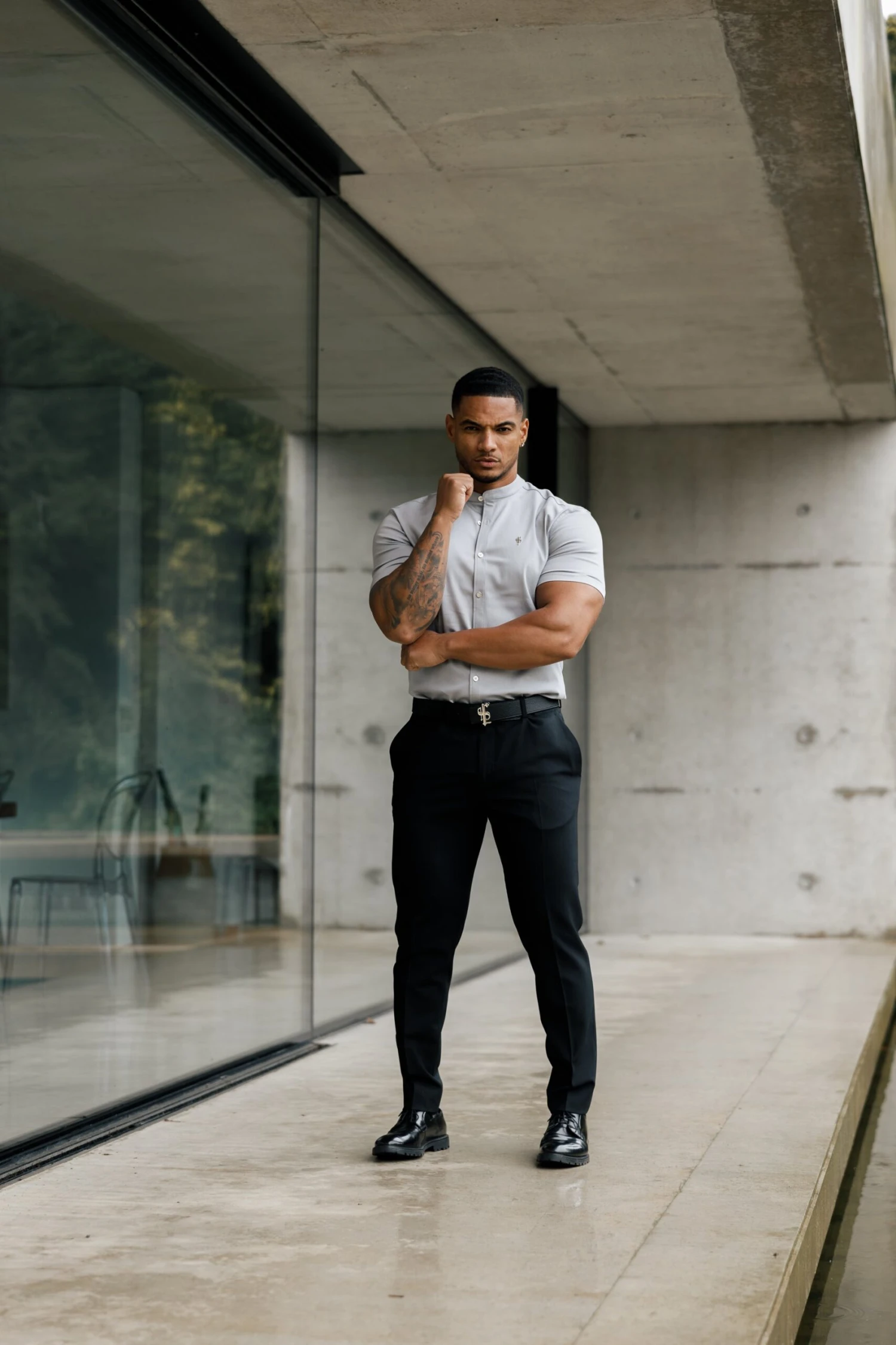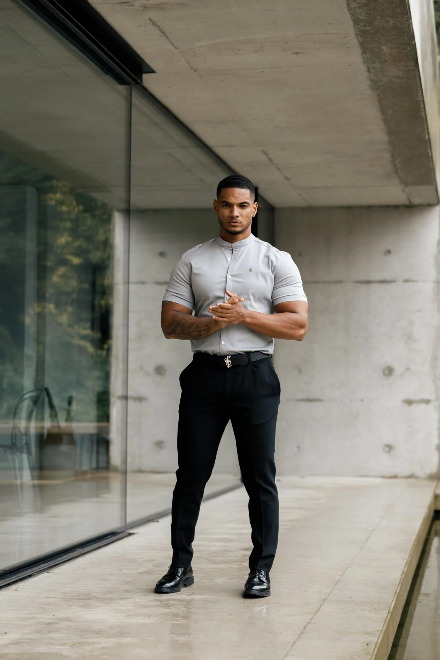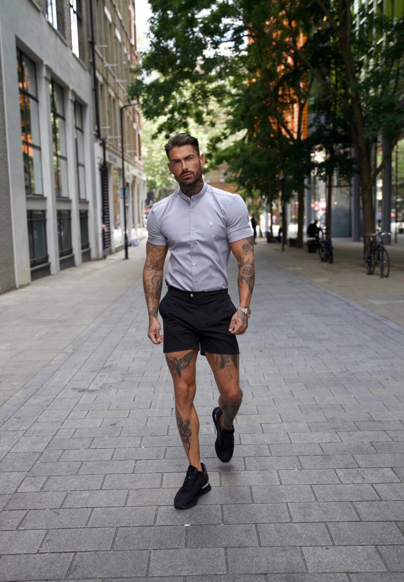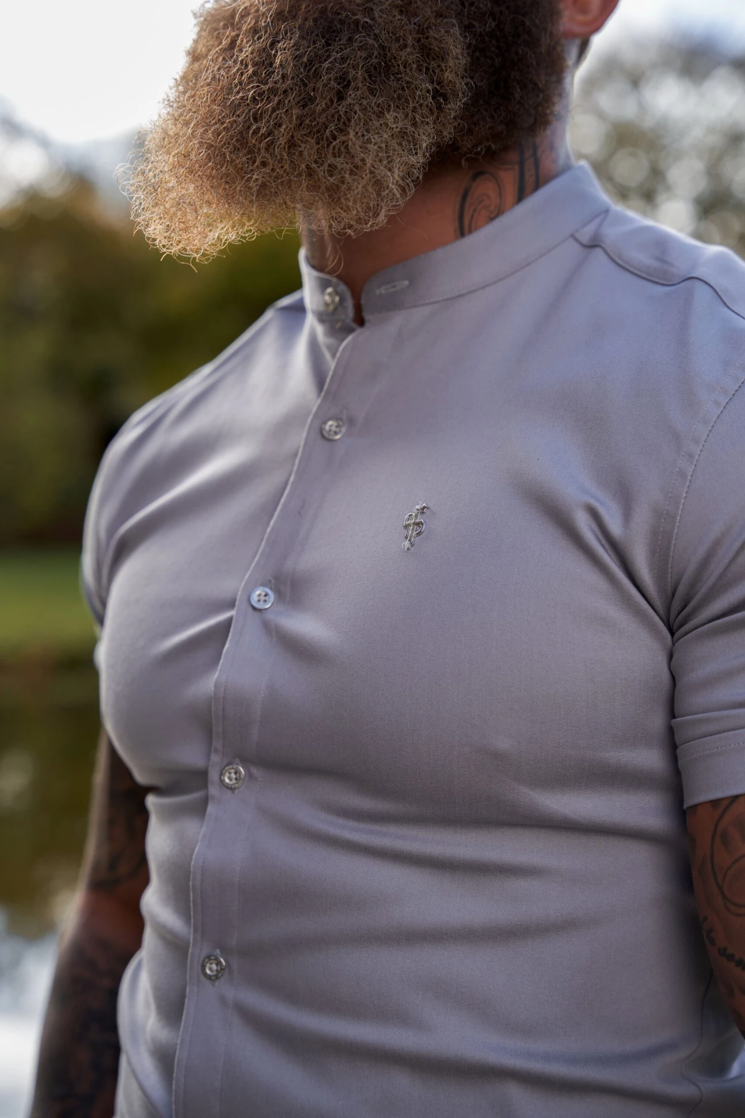 Father Sons Super Slim Stretch Grey Denim Short Sleeve with Grandad Collar and Silver Metal Buttons and Decal FS963