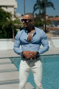 Father Sons Super Slim Stretch Light Blue Printed Pinstripe Long Sleeve with Grandad Collar – FS1059