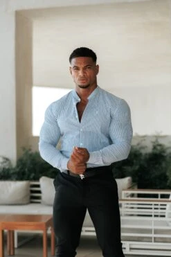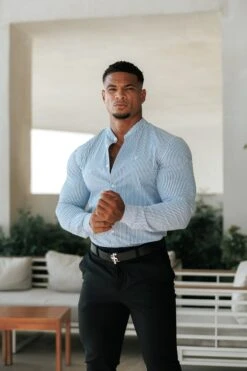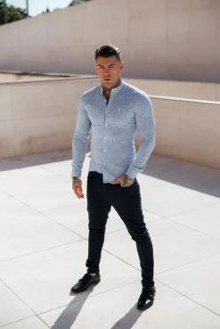Father Sons Super Slim Stretch LS Navy & White Stripe with Grandad Collar – FS1113