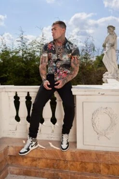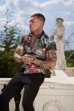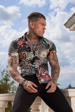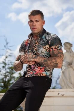 Father Sons Super Slim Stretch Multi Oriental Print Short Sleeve with Button Down Collar – FS766