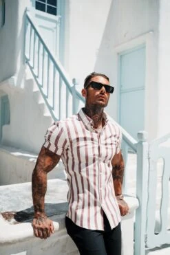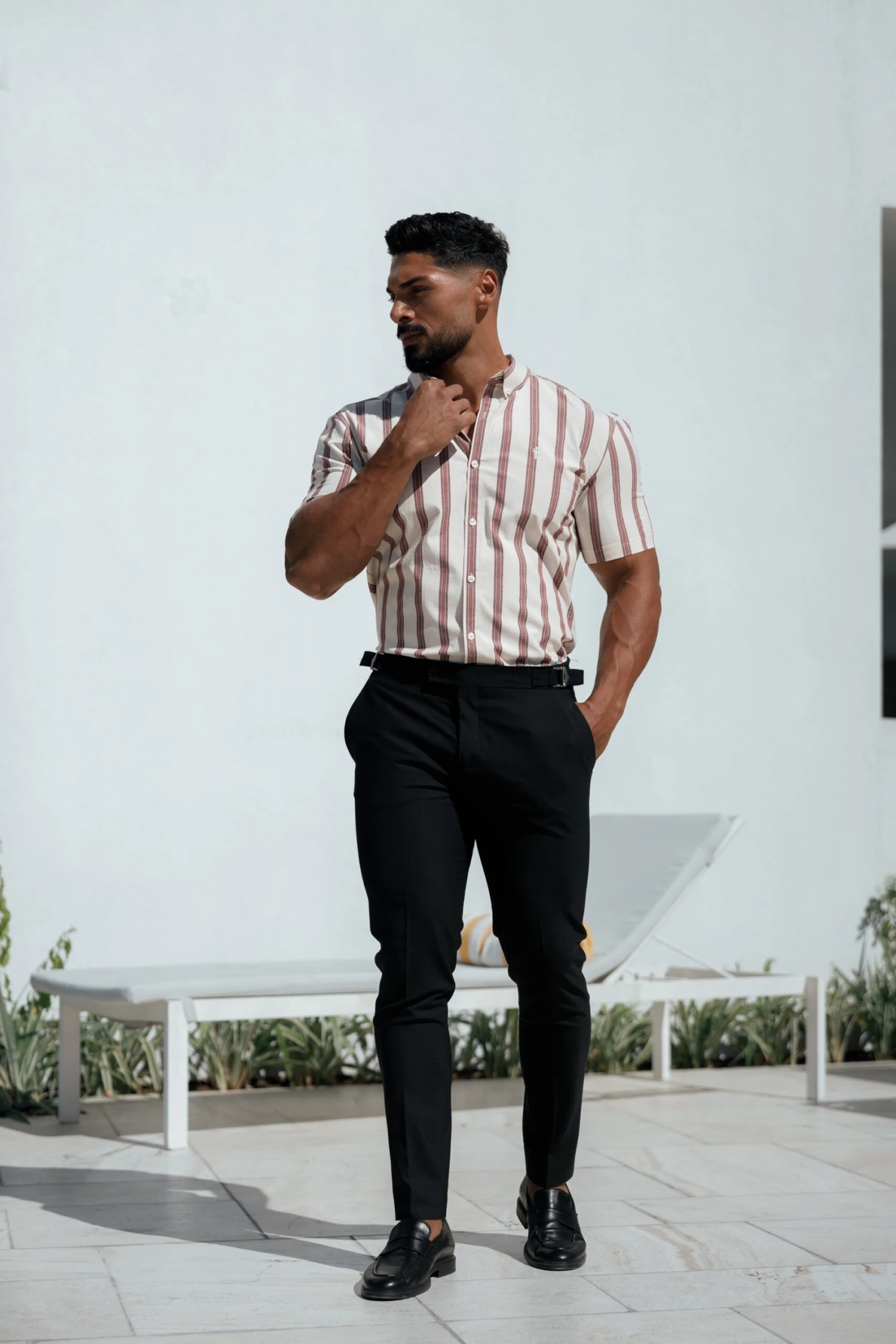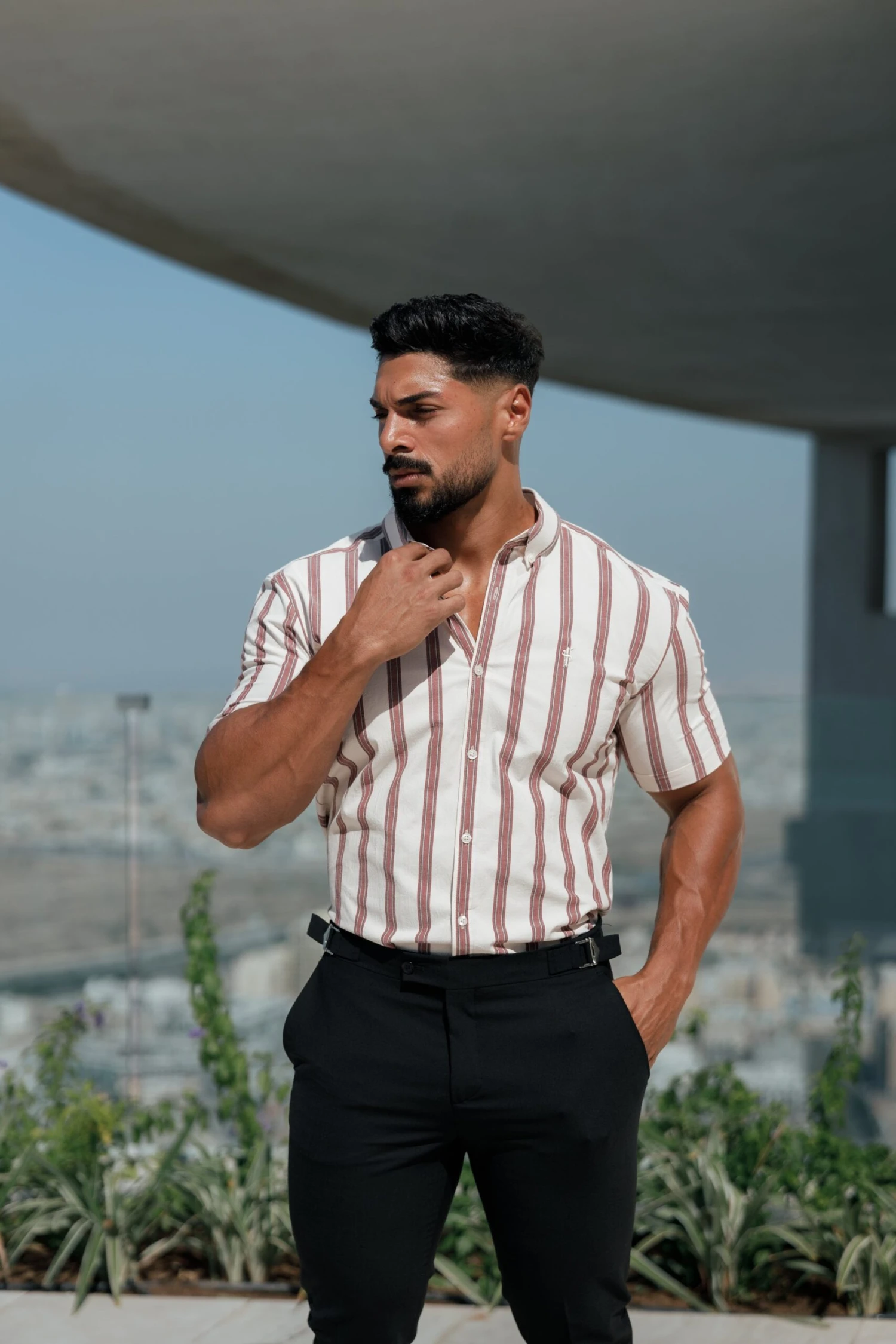Father Sons Super Slim Stretch Off White / Burgundy Woven Stripe Short Sleeve with Button Down Collar – FS972