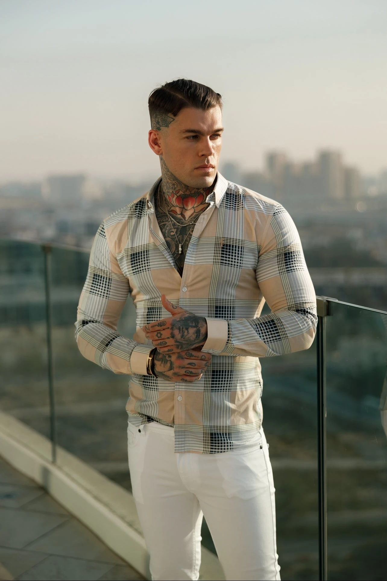 Father Sons Super Slim Stretch Peach / Grey Check Print Long Sleeve with Button Down Collar – FS901