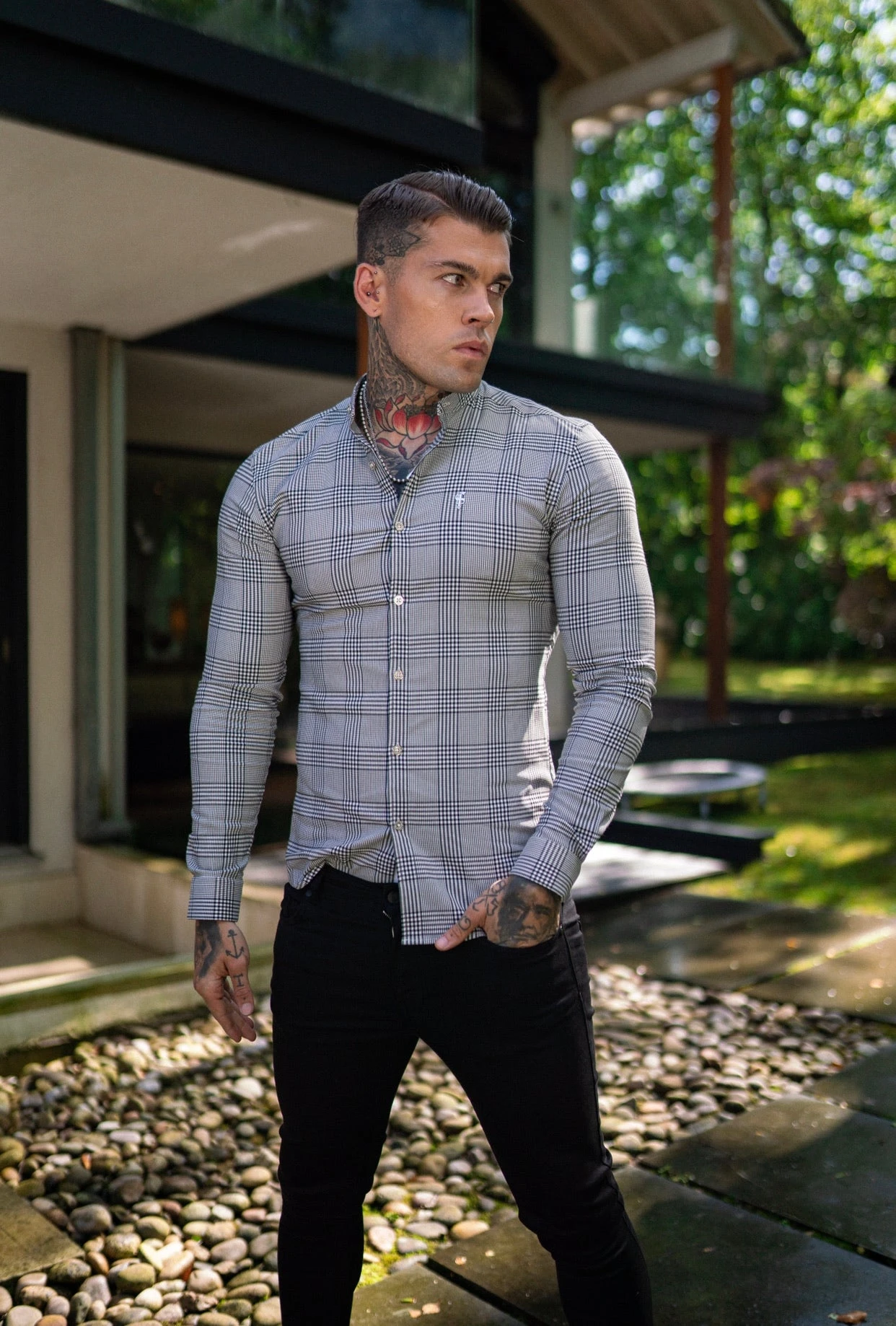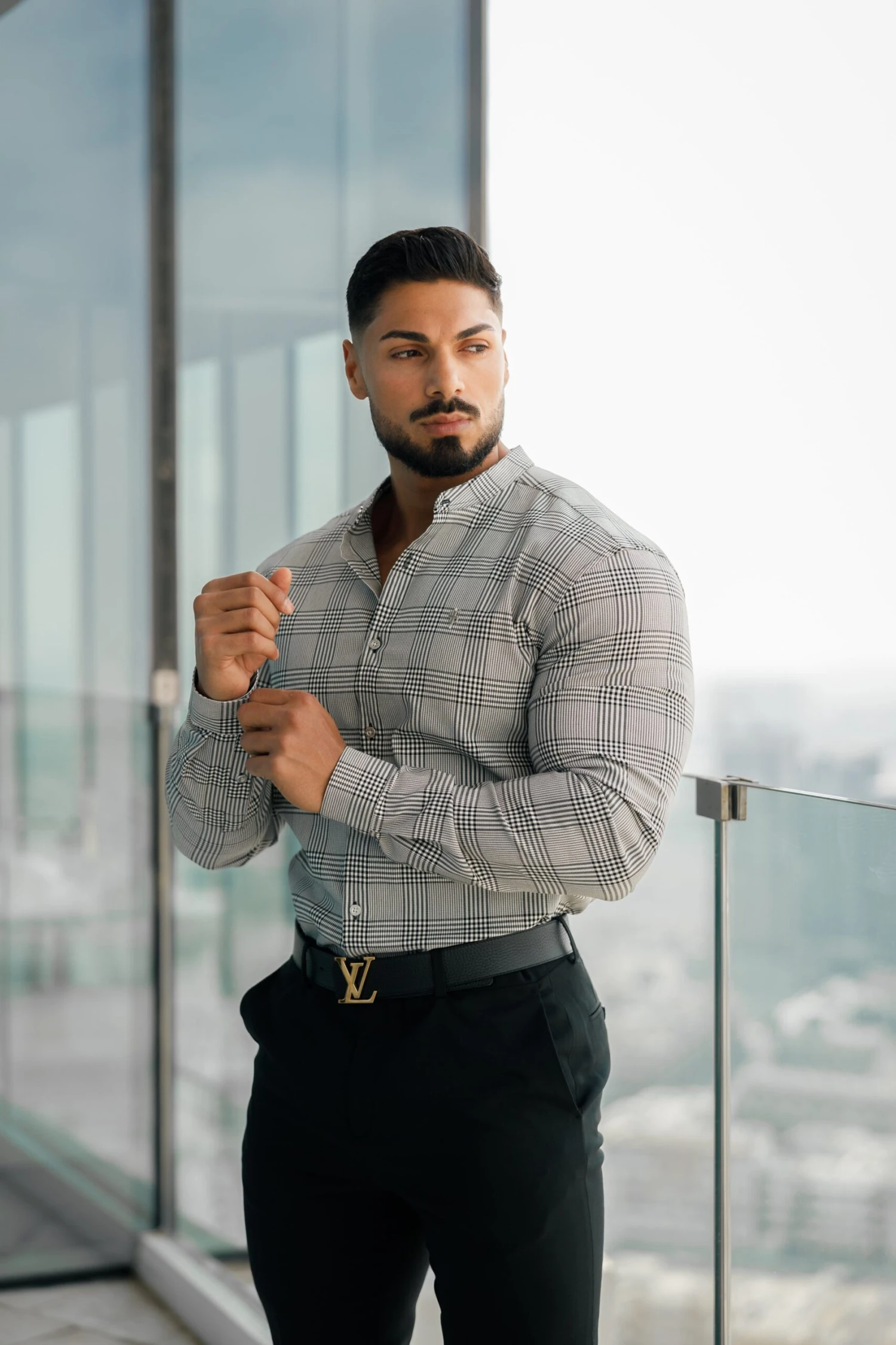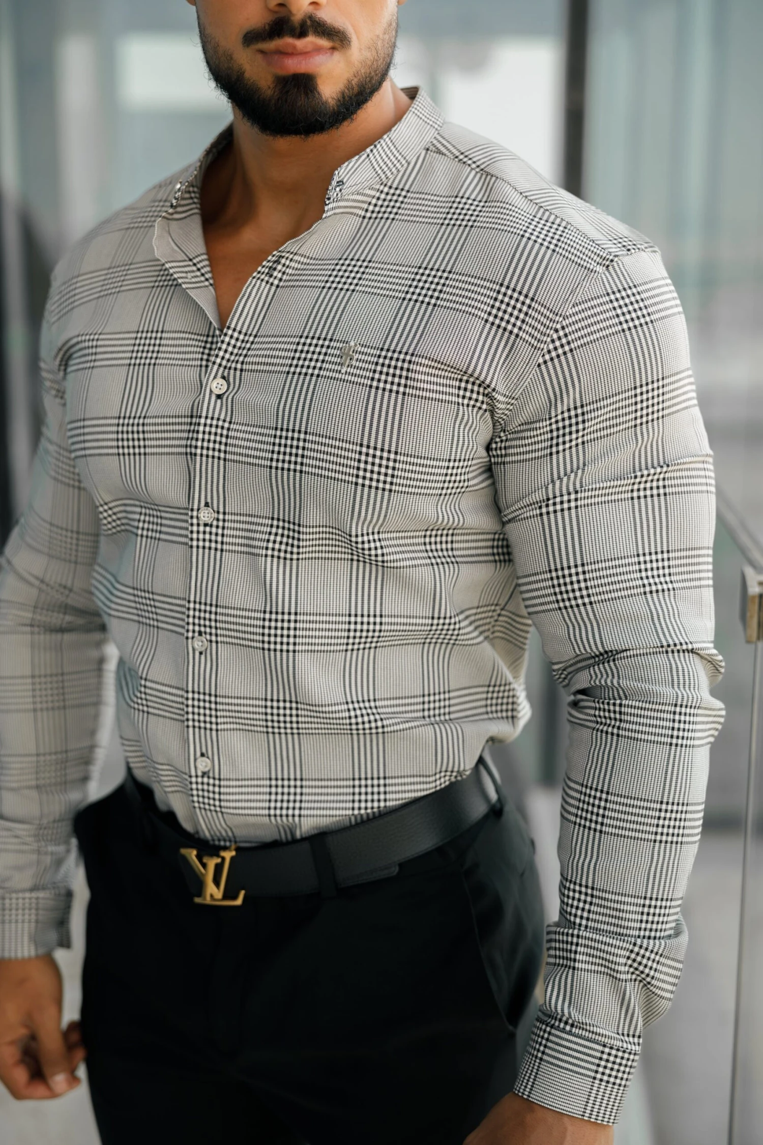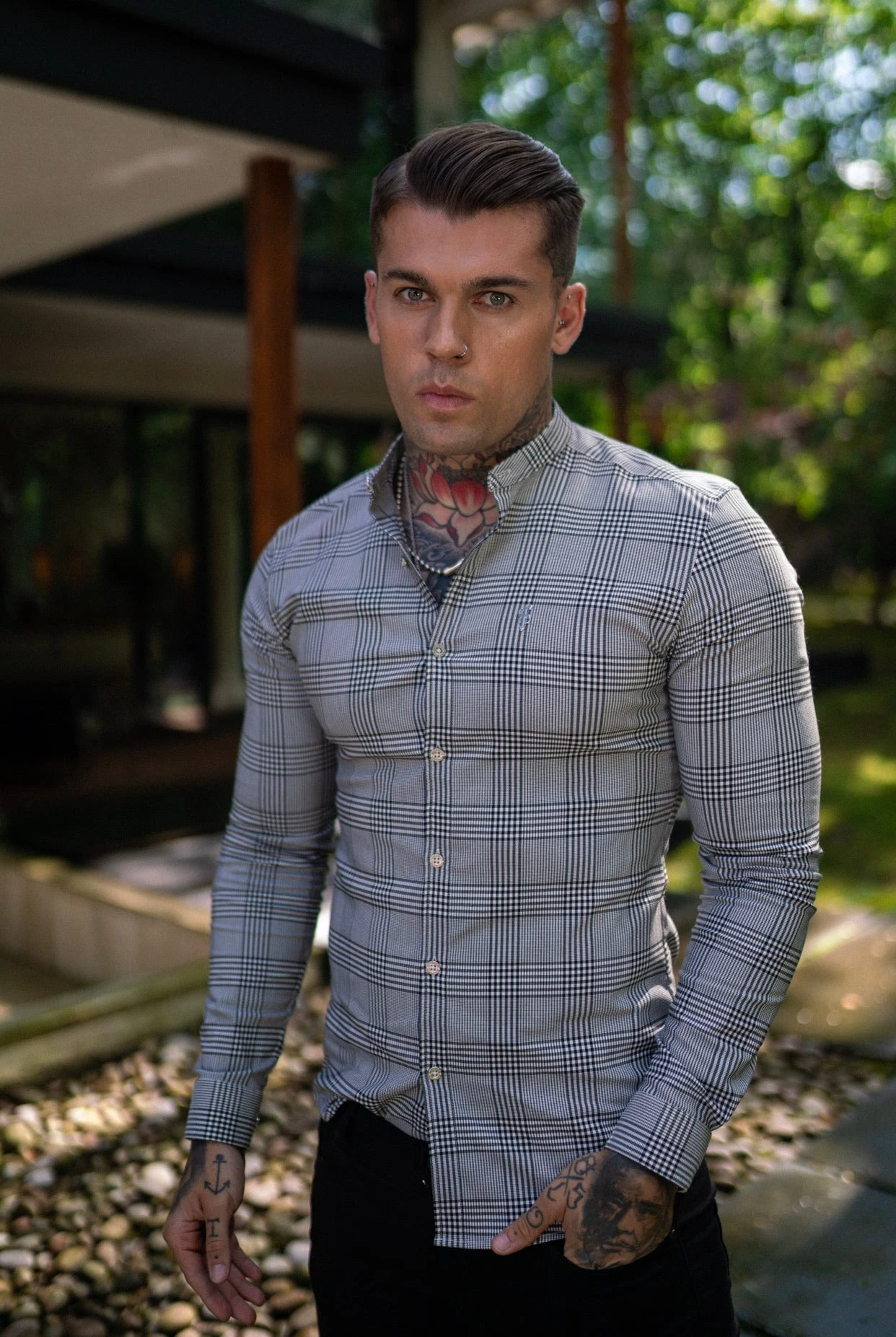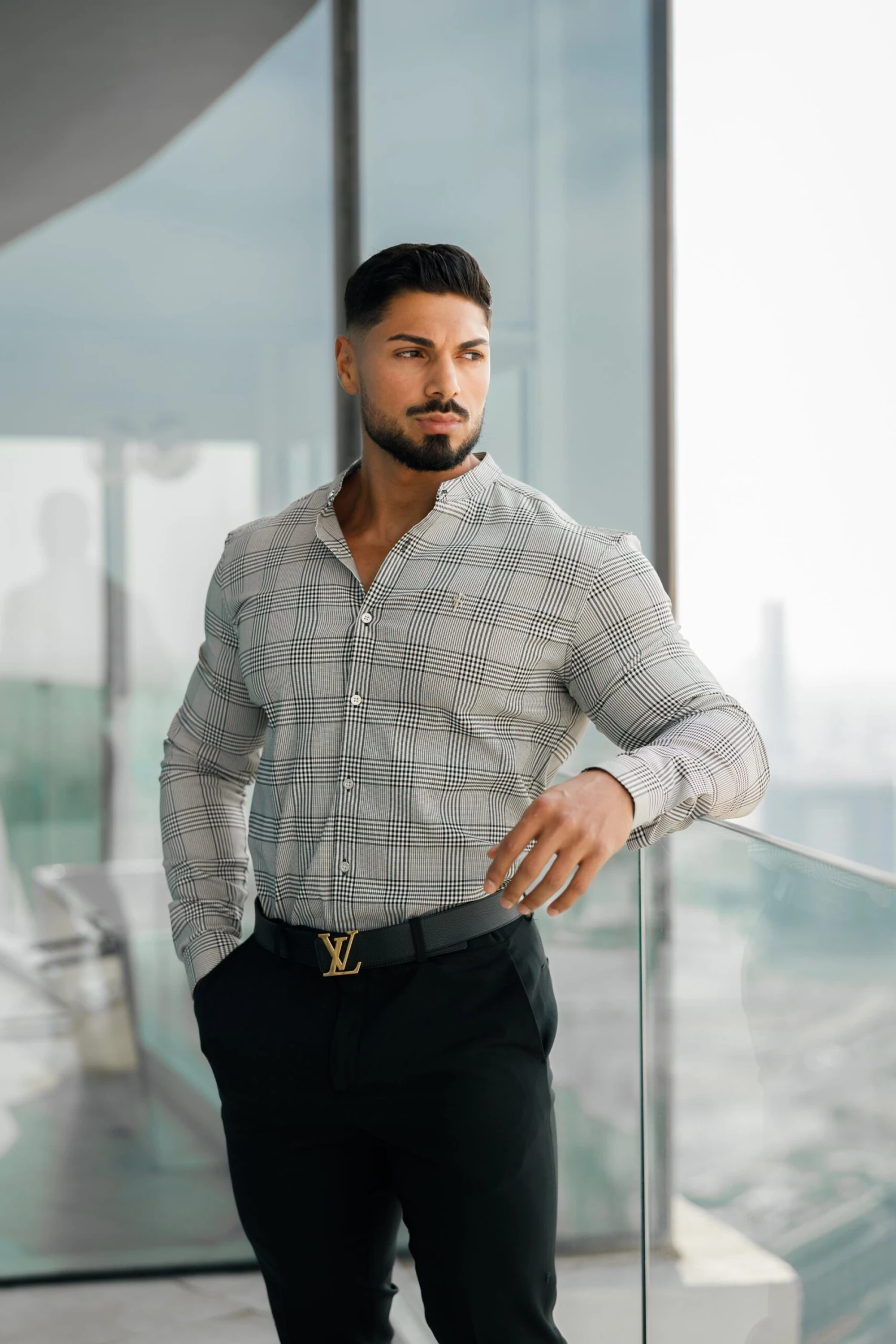 Father Sons Super Slim Stretch Prince Of Wales White and Black Check Long Sleeve Grandad Collar with Metal Buttons and Emblem – FS733