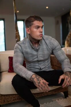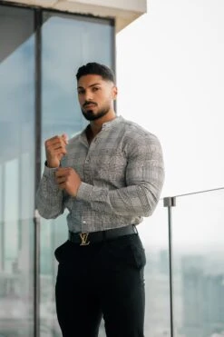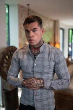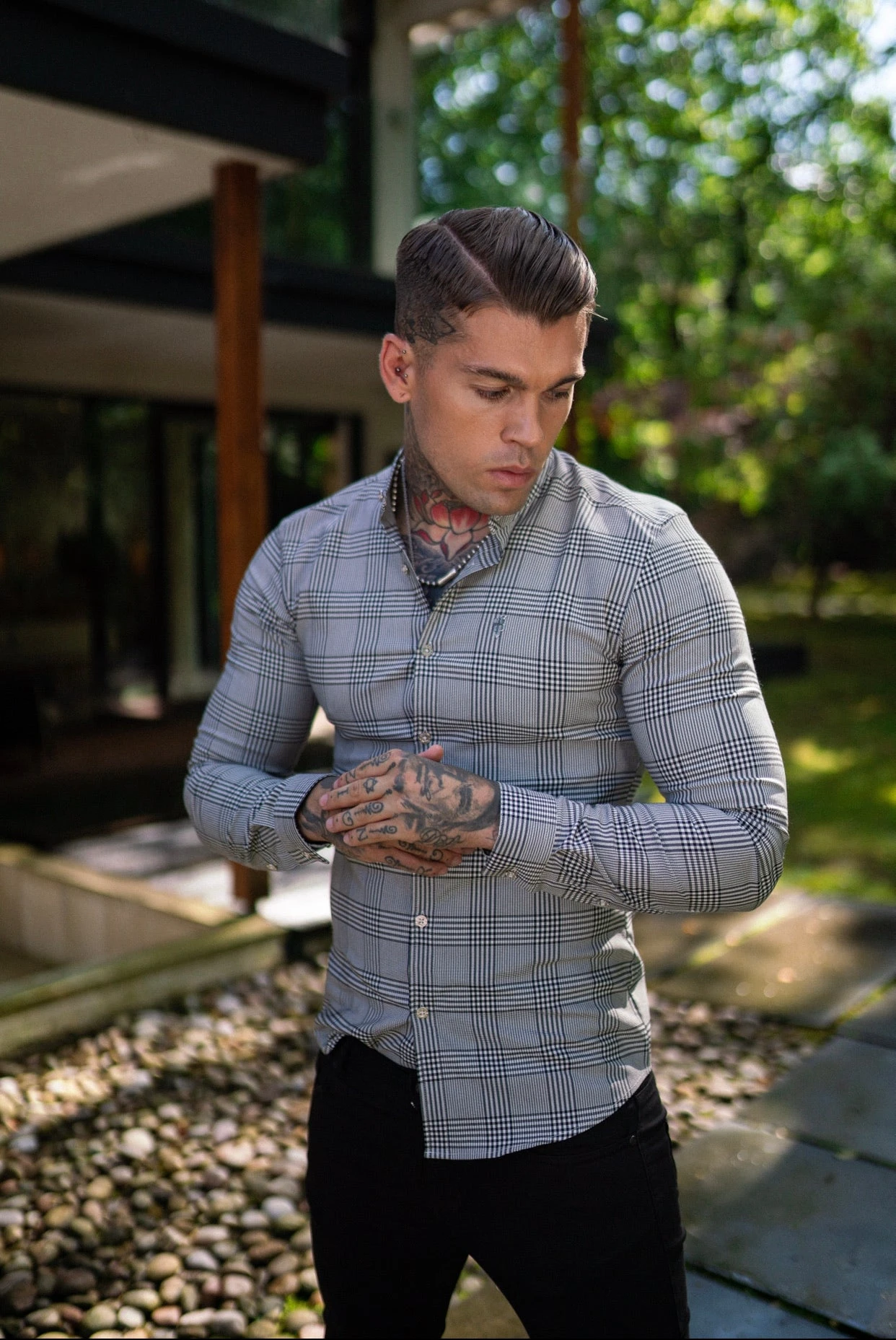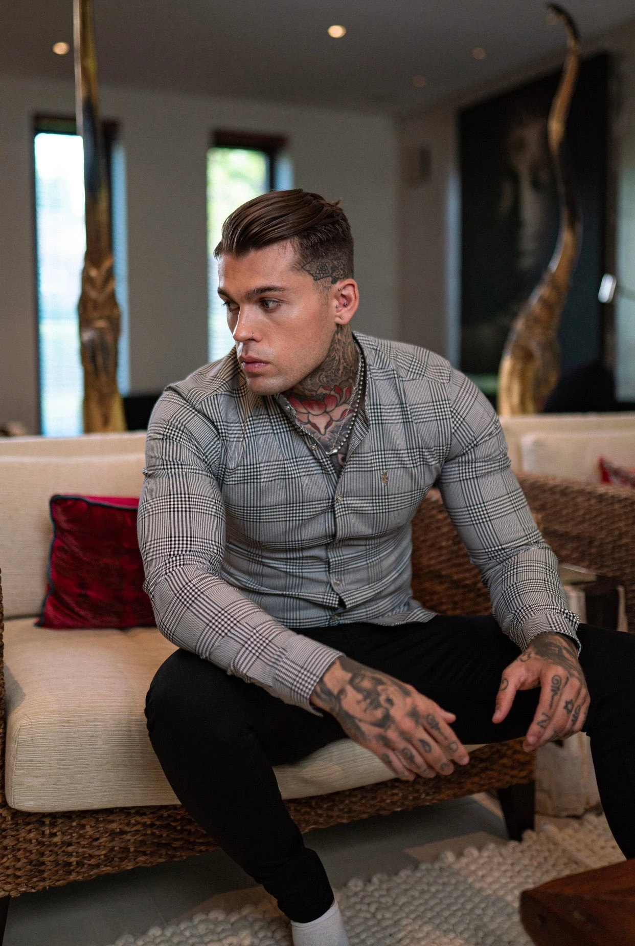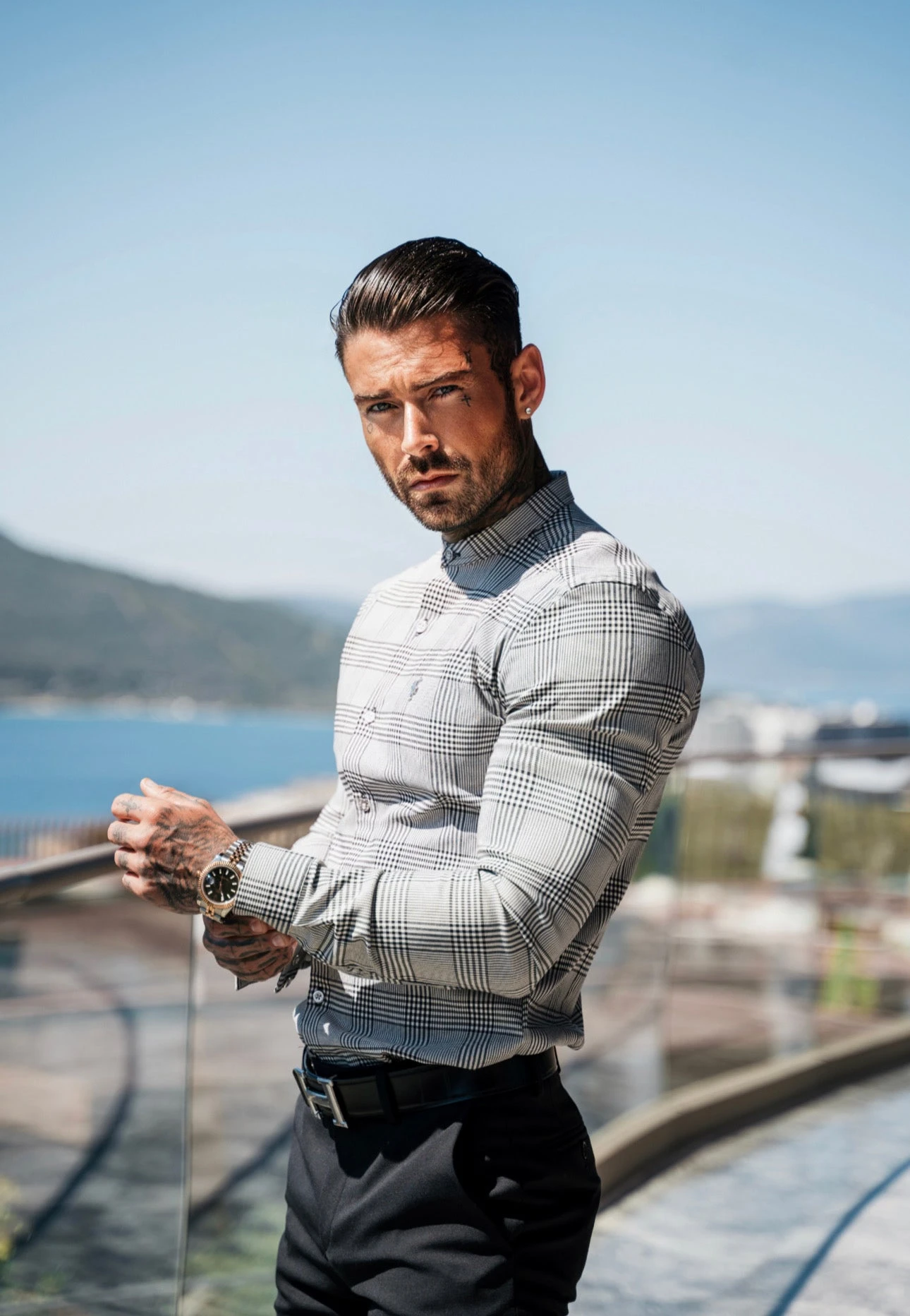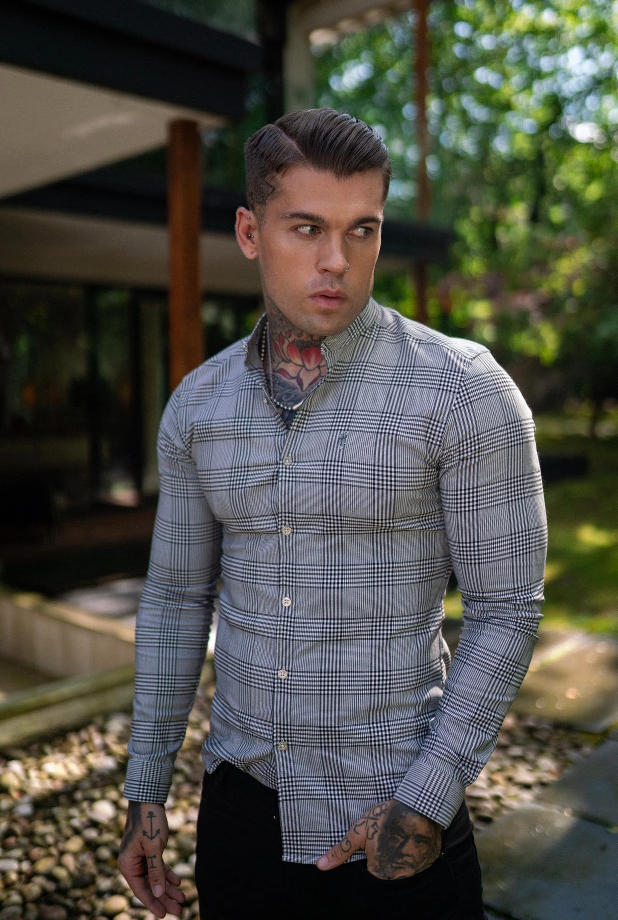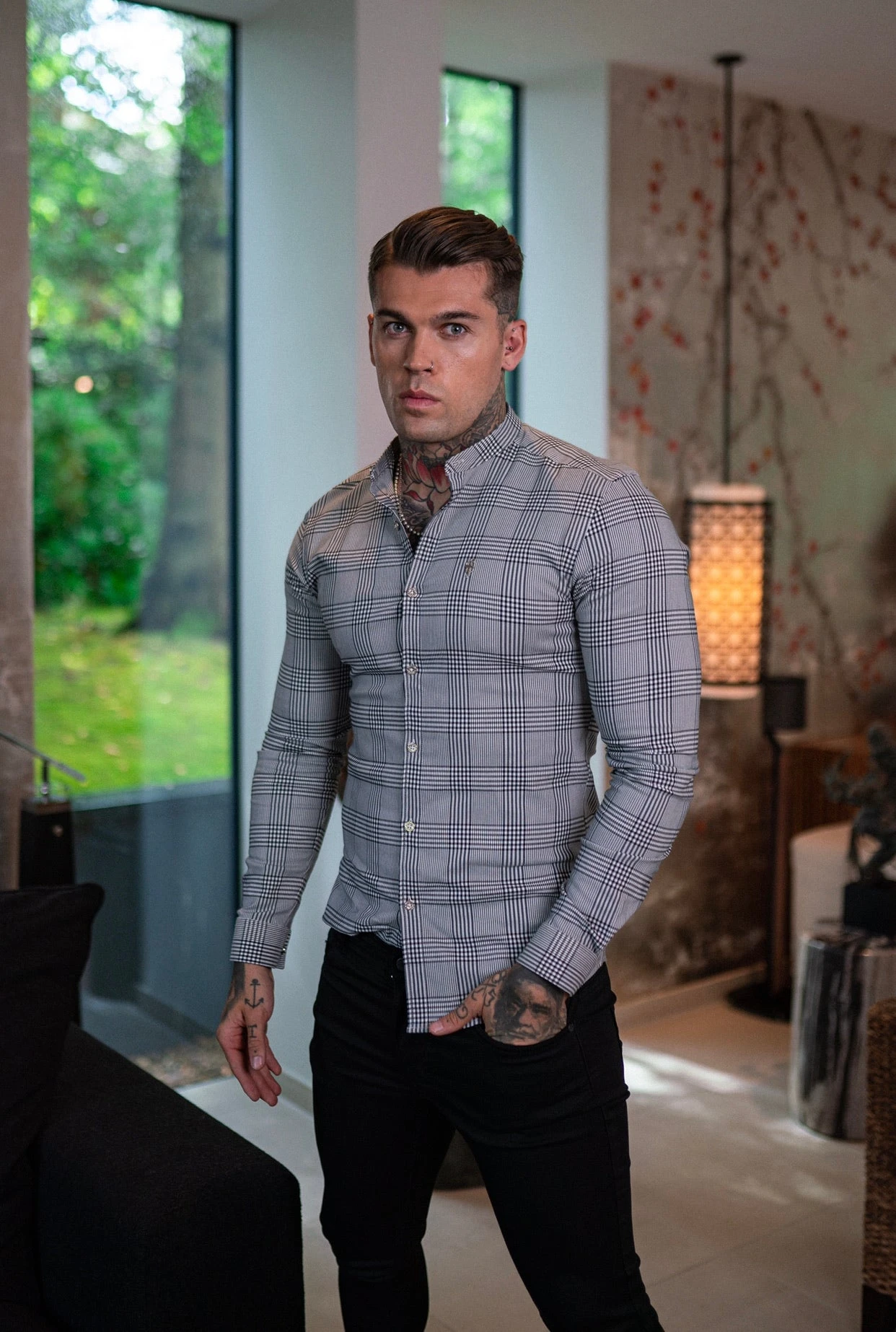 Father Sons Super Slim Stretch Prince Of Wales White and Black Check Long Sleeve Grandad Collar with Metal Buttons and Emblem – FS733
