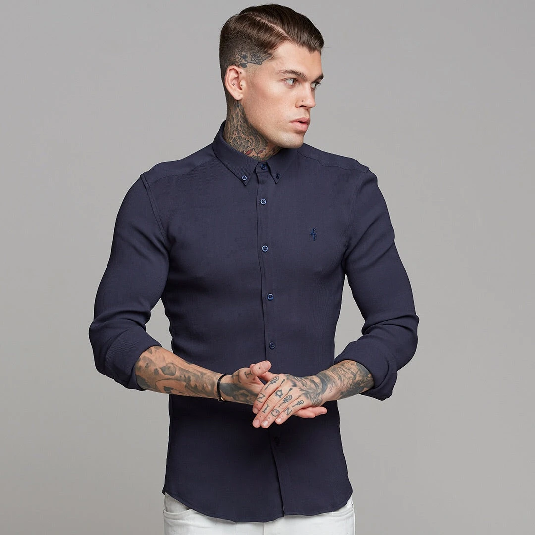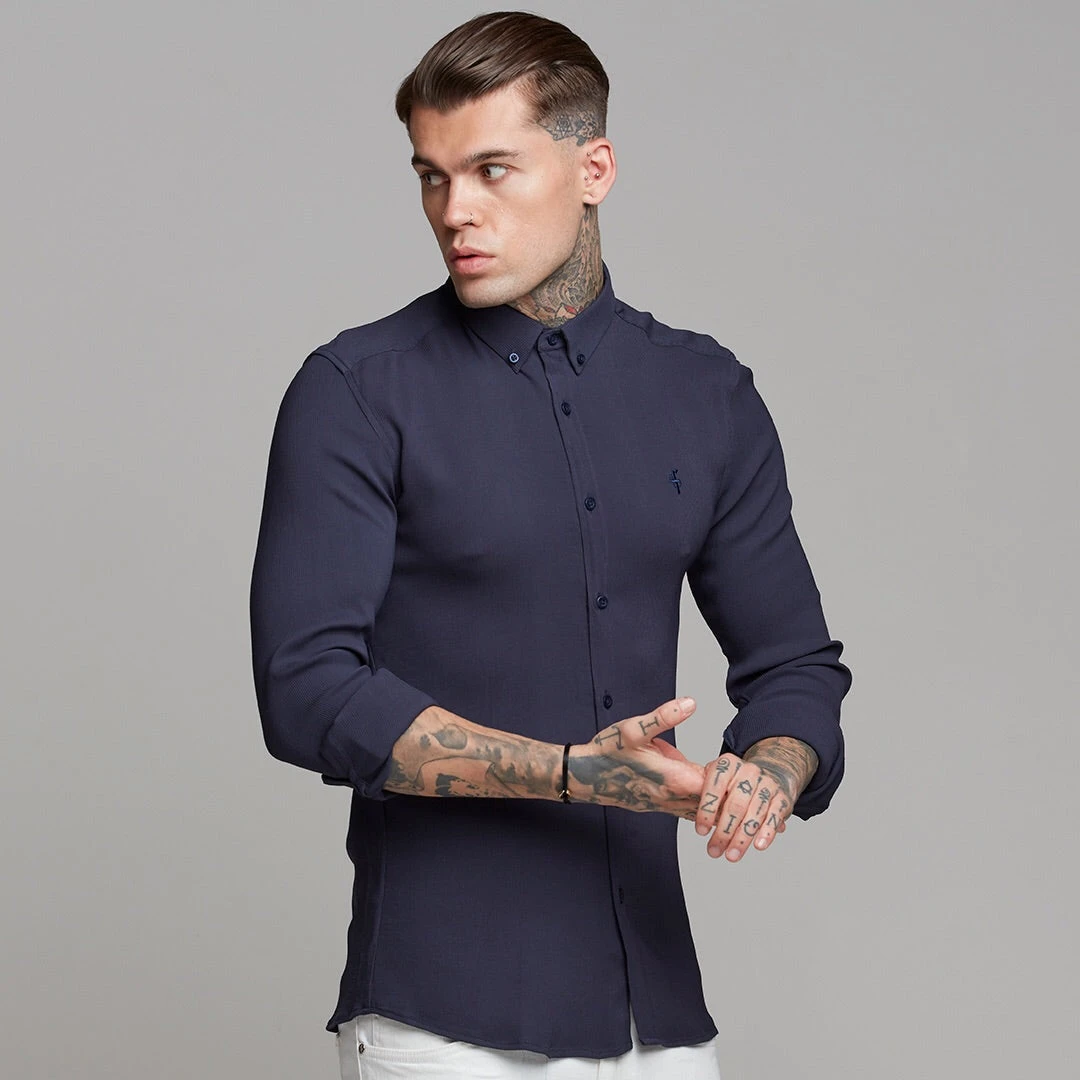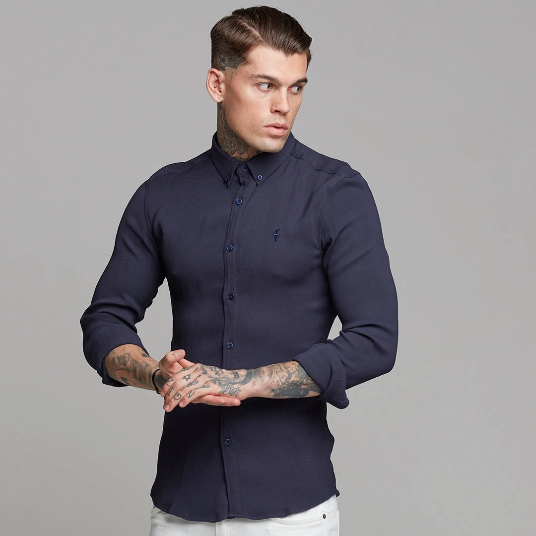 Made of the finest textured stretch cotton creating a ribbed effect and featuring the Father Sons emblem. The shirt is also made up of Elastane, this allows the shirt to stretch for the perfect fitted shirt. This design is for the gentleman looking for a super slim fit.