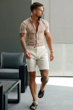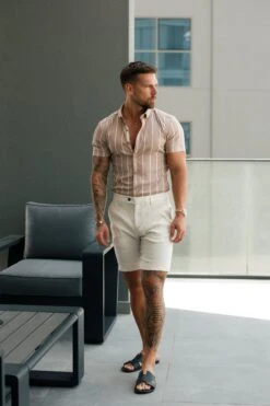 Father Sons Super Slim Stretch Taupe Printed Wide Stripe Short Sleeve with Button Down Collar – FS1066