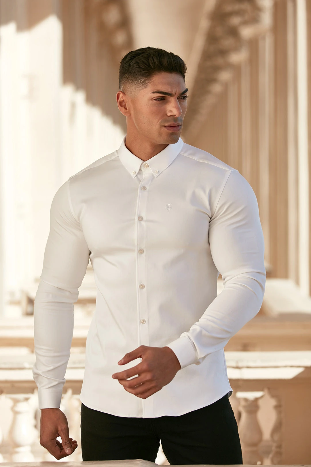 Made of the finest denim stretch cotton featuring the Father Sons emblem. The shirt is also made up of Elastane, this allows the shirt to stretch for the perfect fitted shirt. This design is for the gentleman looking for a super slim fit.
