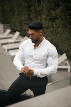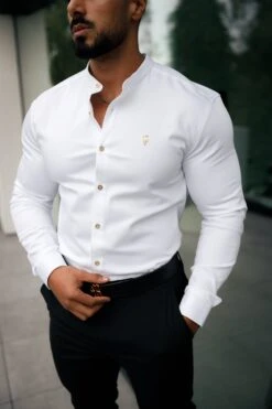Father Sons Super Slim Stretch White Denim Long Sleeve Grandad collar with Metal Buttons and Decal Emblem – FS719