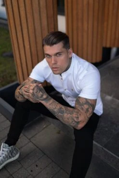 Father Sons Super Slim Stretch White Denim Short Sleeve Grandad collar with Metal Buttons and Decal Emblem – FS720