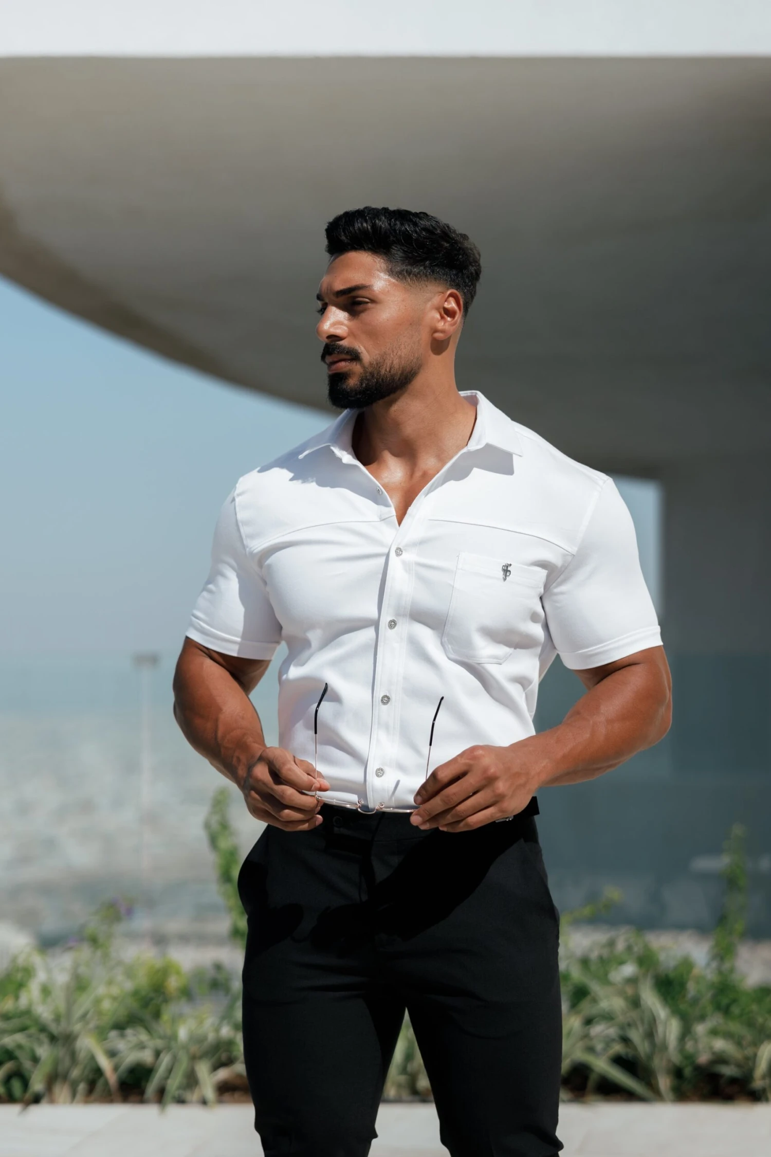Father Sons Super Slim Stretch White Denim Short Sleeve with Horizontal Seam and Pocket – FS956