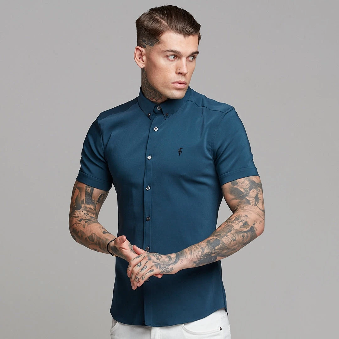 Father Sons Super Slim Ultra Stretch Classic Teal Short Sleeve (Charcoal Buttons) – FS485