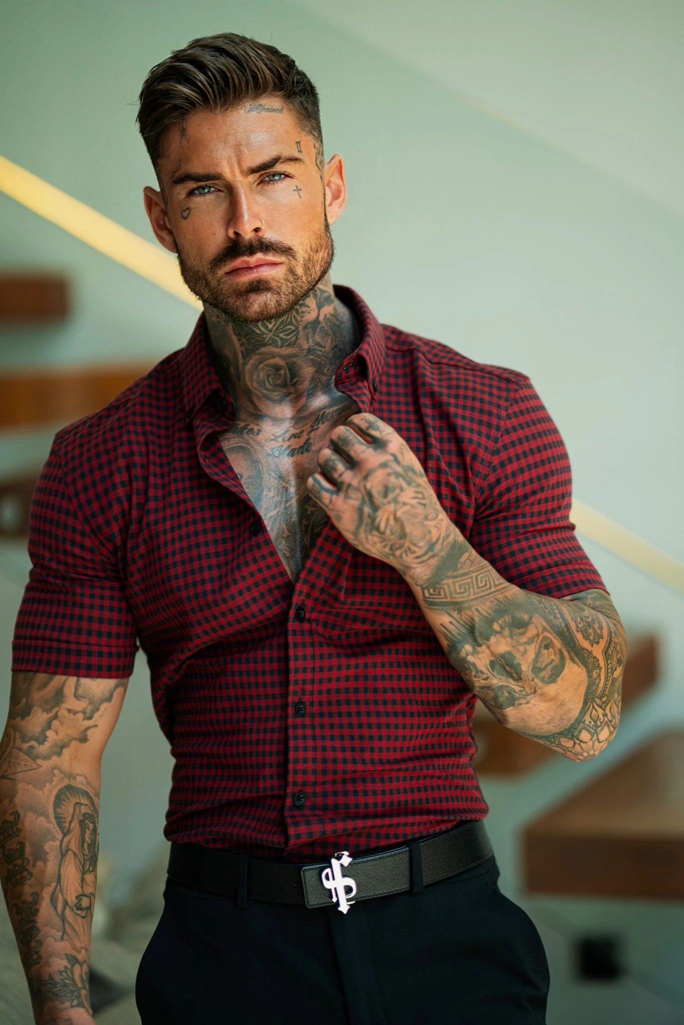 Father Sons Super Slim Ultra Stretch Red & Black Check Short Sleeve – FS514