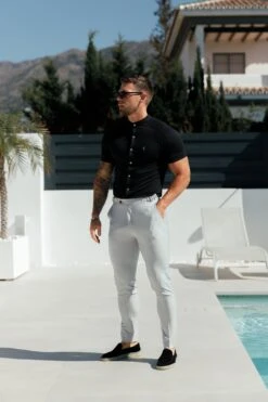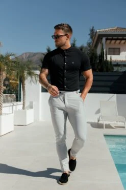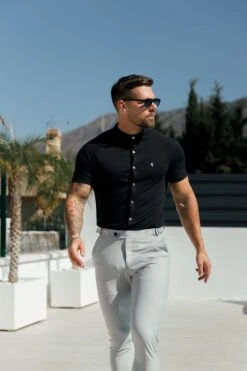 Father Sons Slim Bamboo Grandad Collar Black Short Sleeve – FSH1165